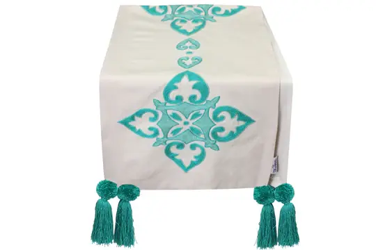 Hand-embroidered Arabesque table runner with pompoms in mint green