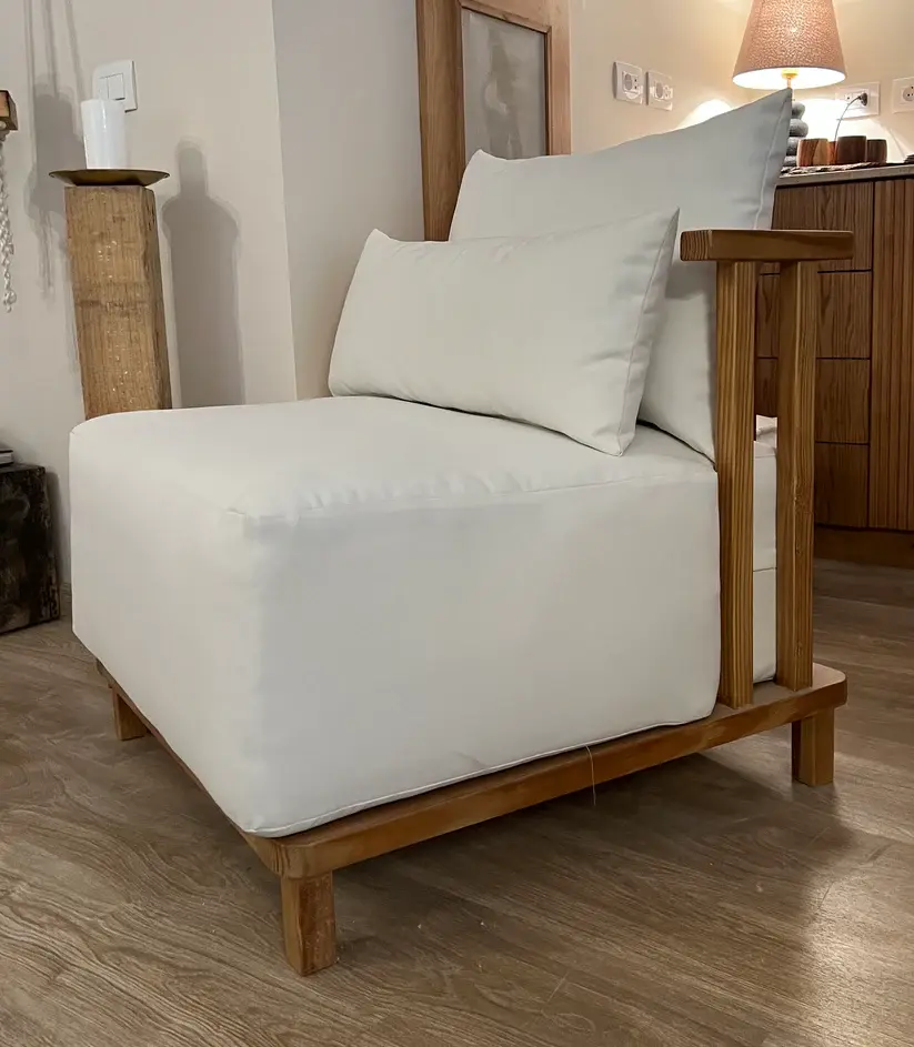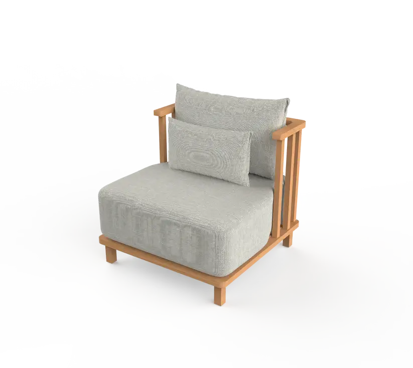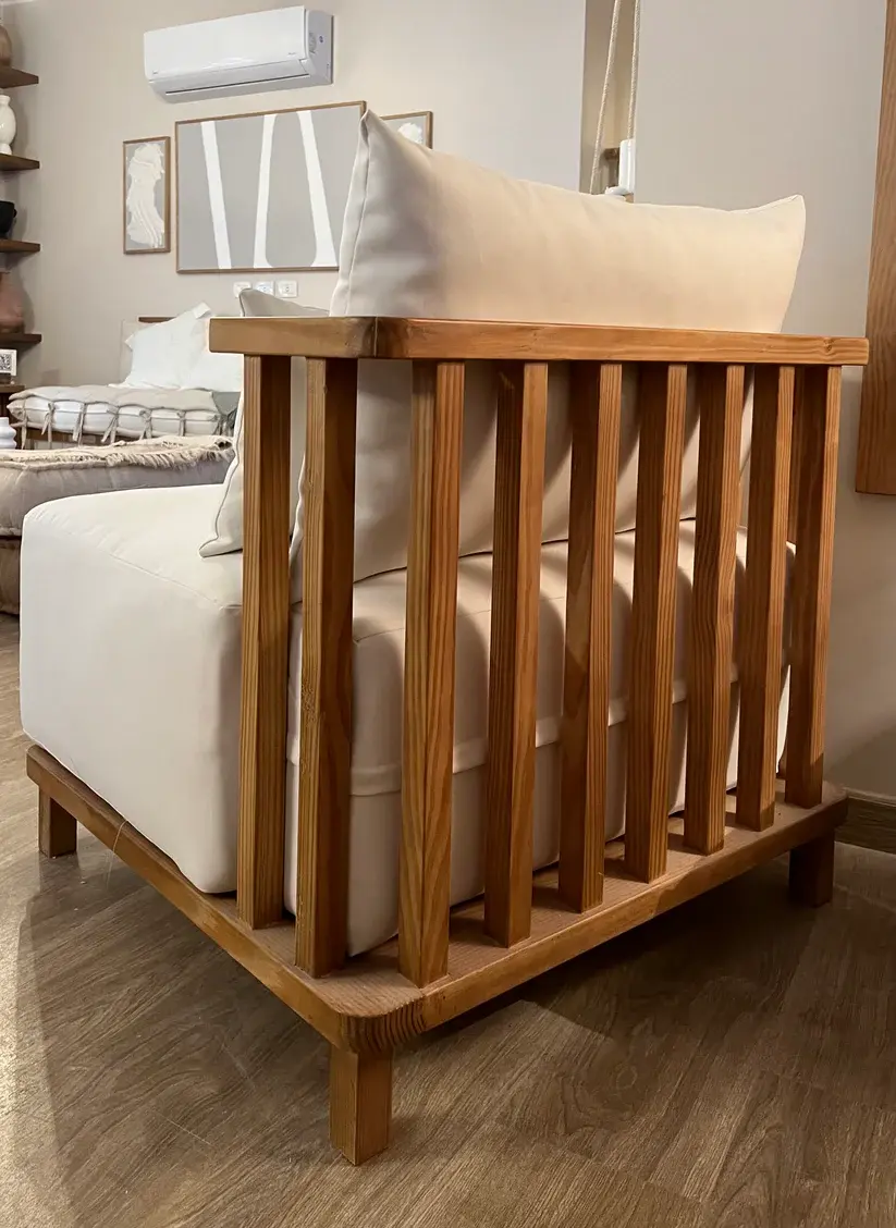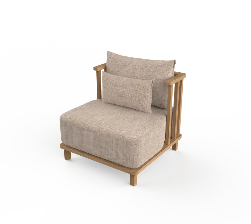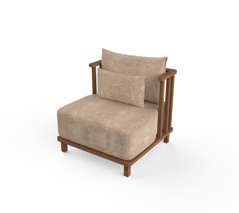 Low lounge chair with wood-striped back and linen cushion