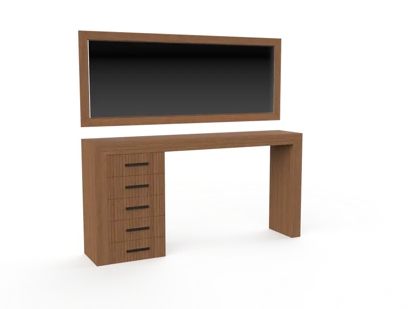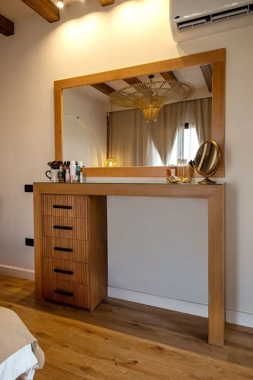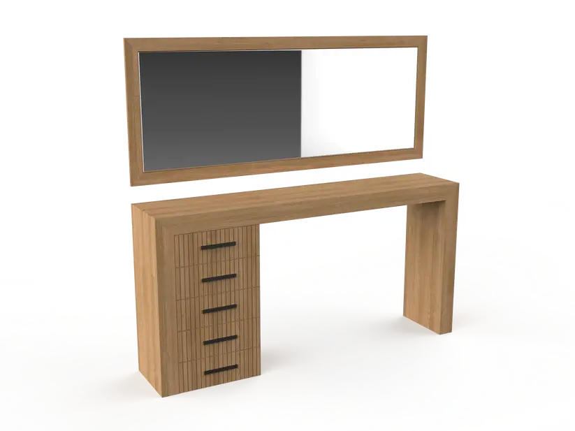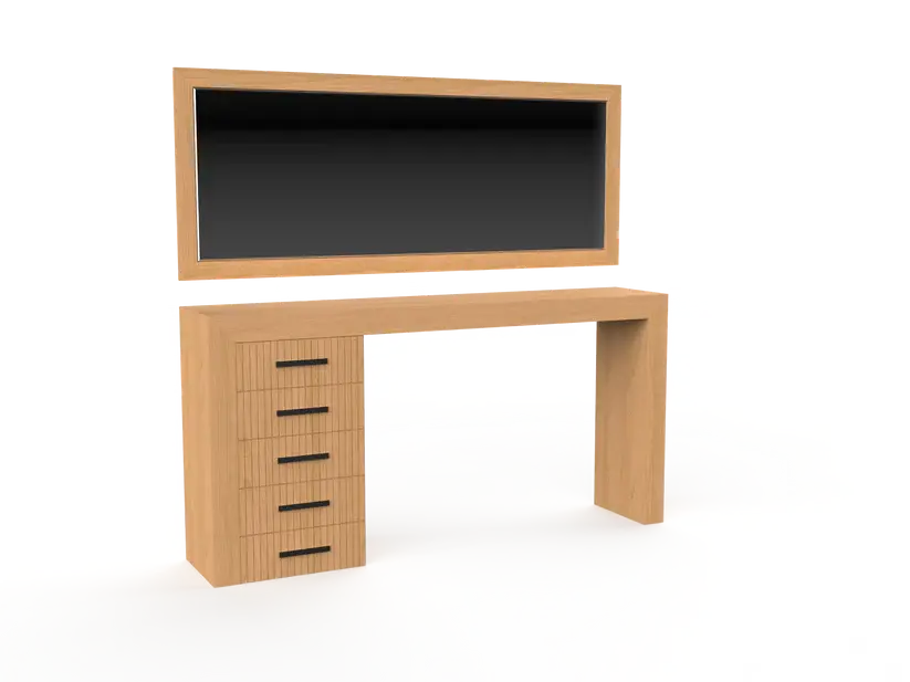 Material: Yellow pine wood integrated with countertop oak veneer, Ester paint with yellow pine wood mirror frame; with black metal handles