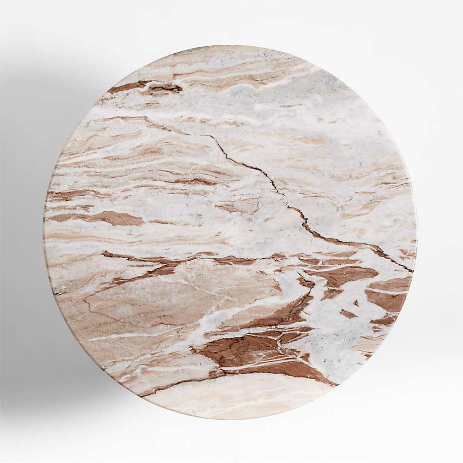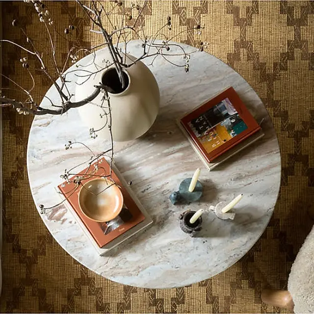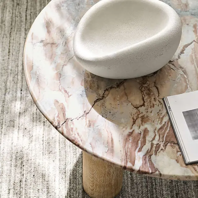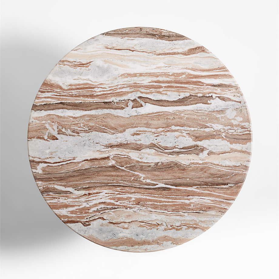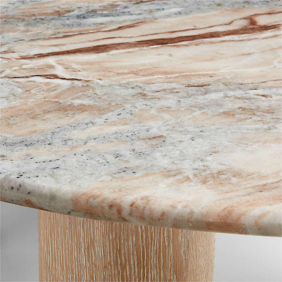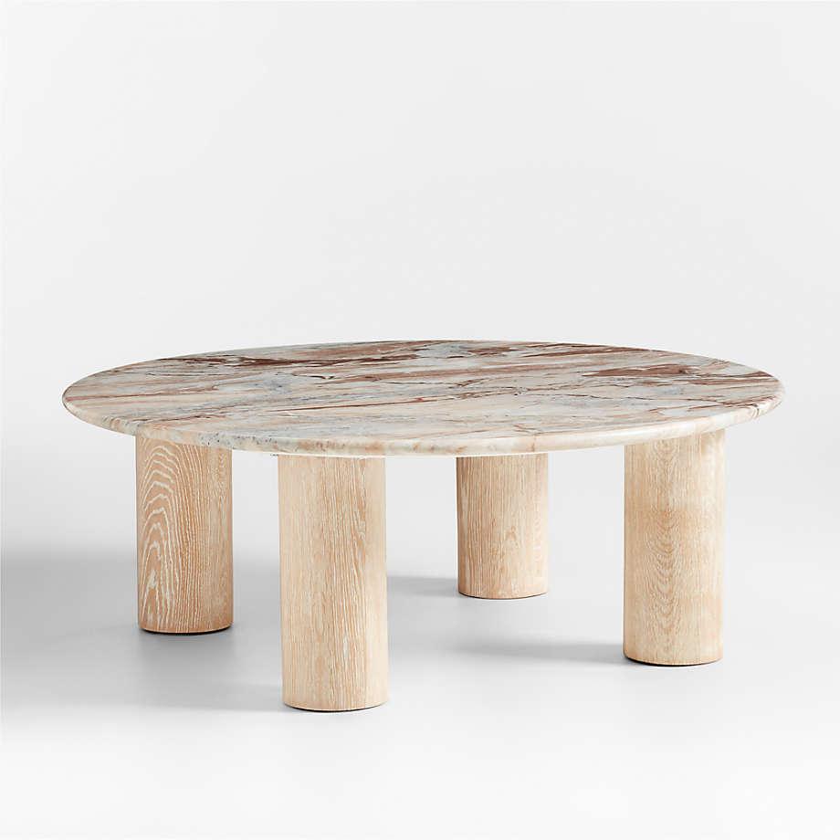 Our Homage coffee table pays tribute to the beauty of natural materials with bold proportions and simple shapes. Styled with smooth bull-nose edges, the round top showcases the uniquely varied earth tones and dramatic veining characteristic of Toronto marble. Oversized cylindrical legs complement the lively grain of white oak, enhanced with an ivory ceruse finish.