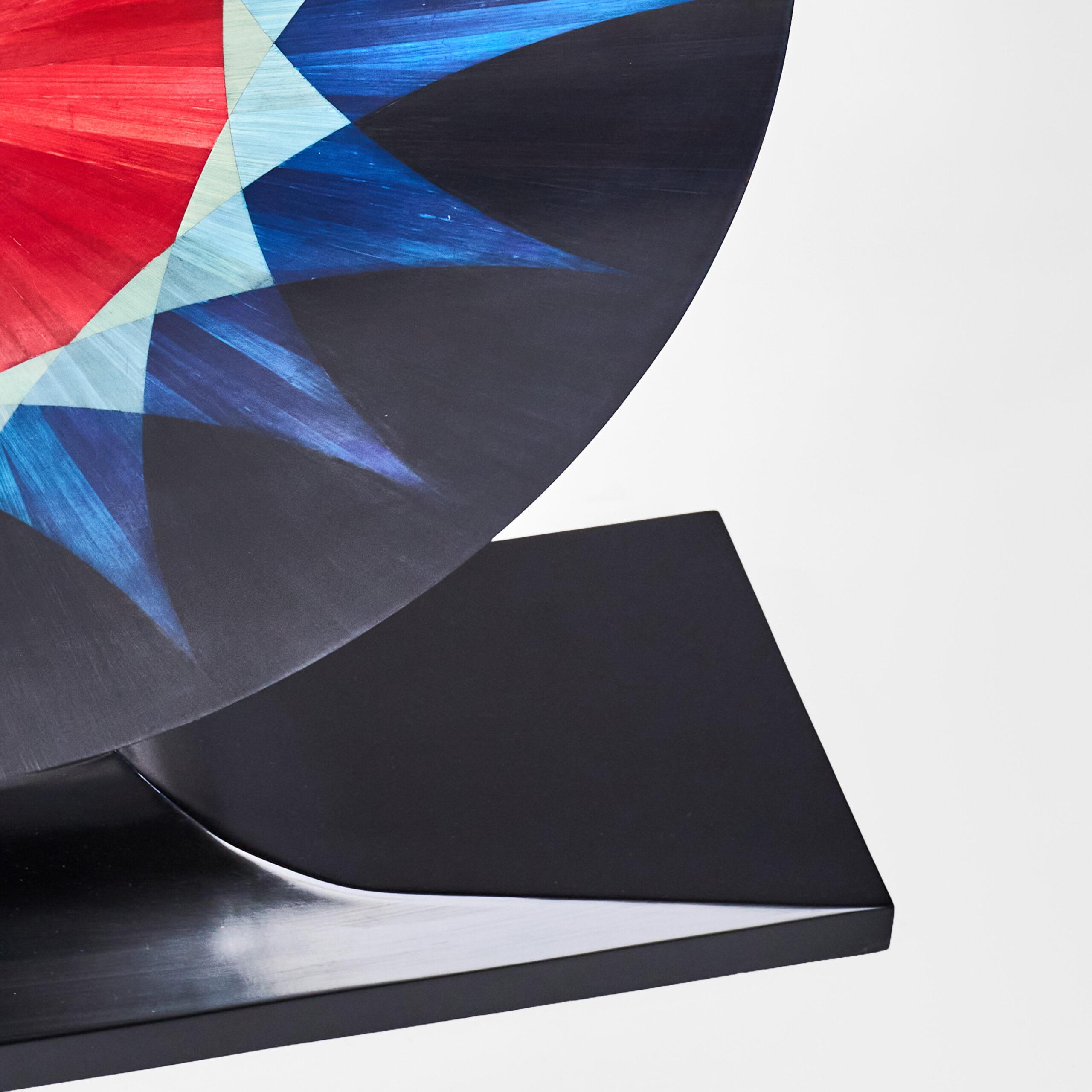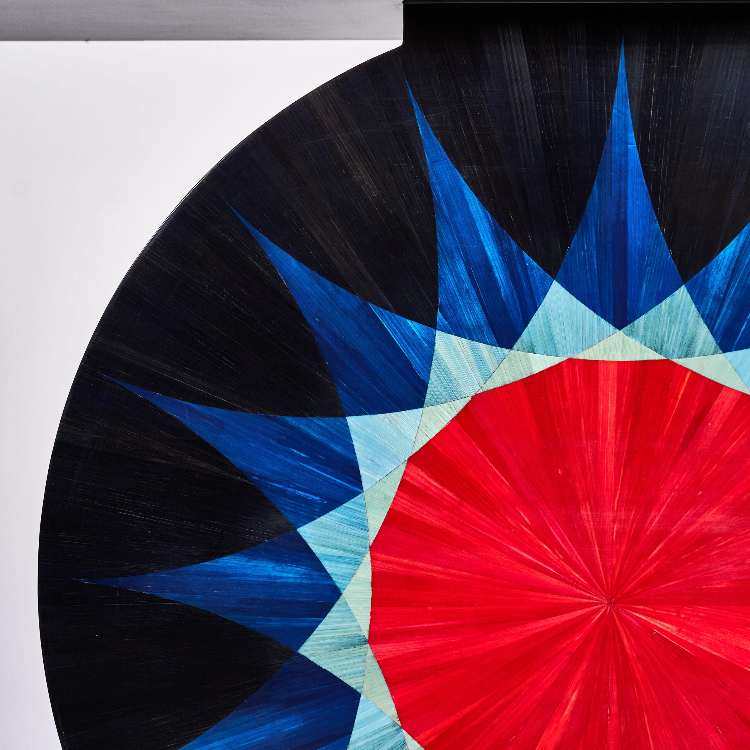 Artistic formation made with art straw marquetry. The circular design philosophy of the console, with a combination of hot colors red, green, blue, and black, gives a more sense of luxury and energy
