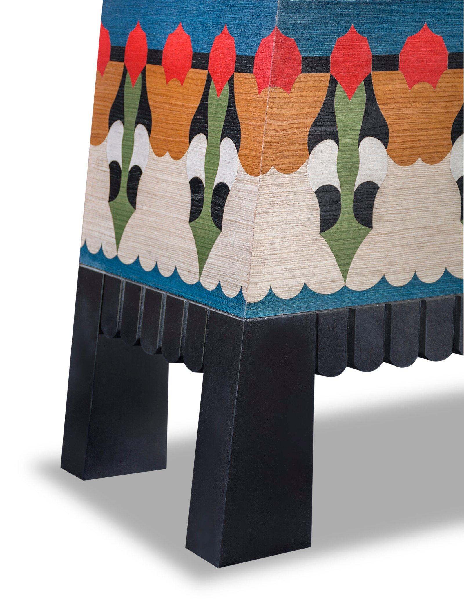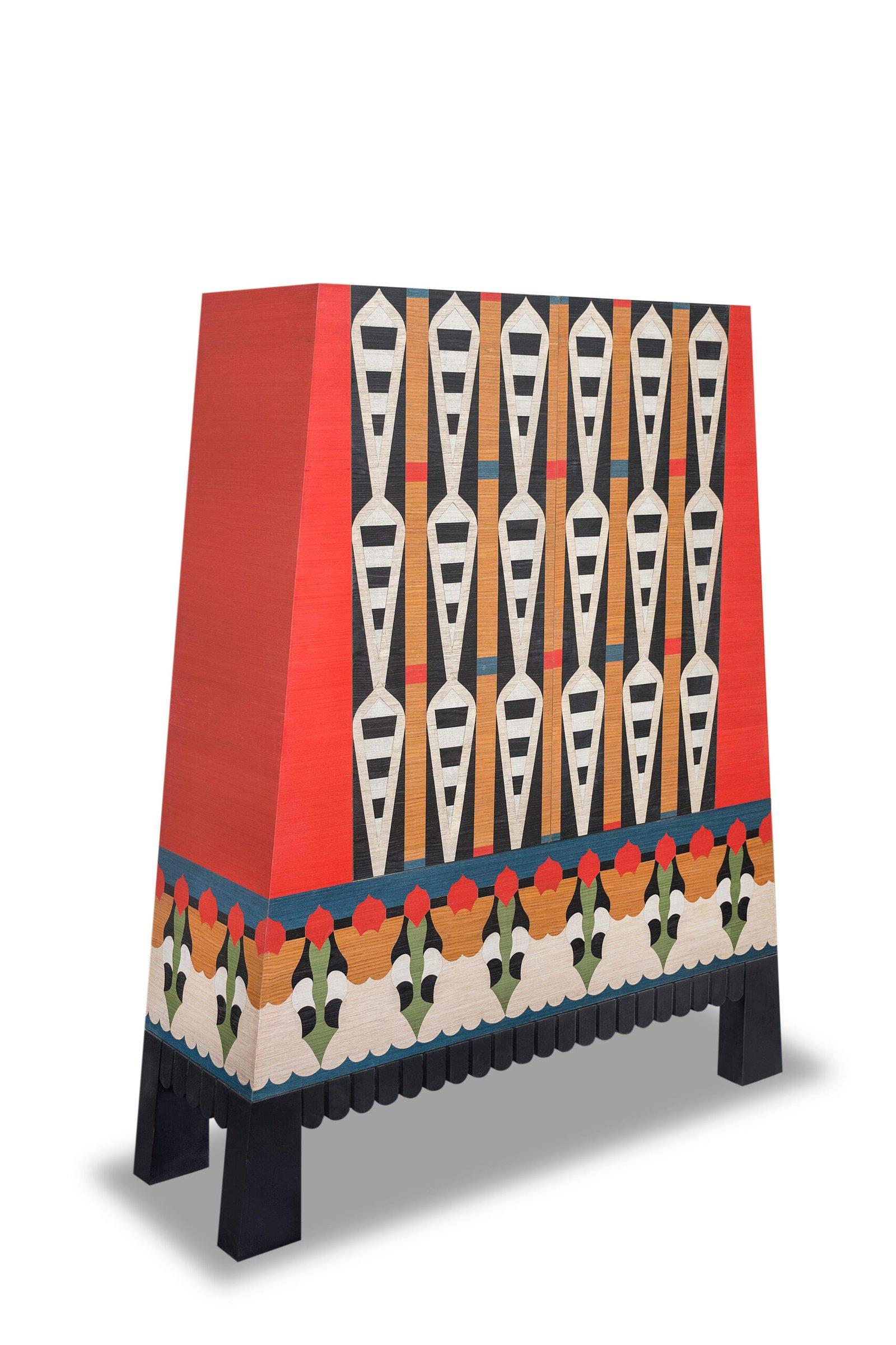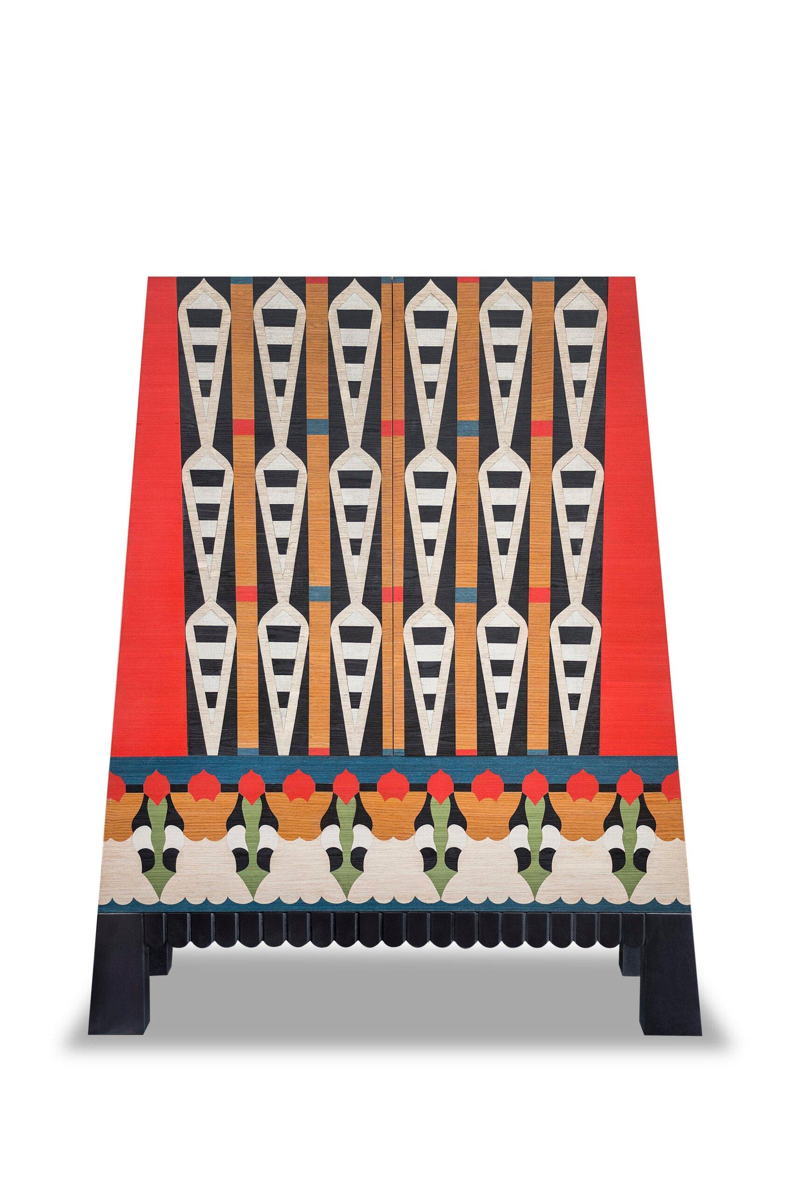 Dimensions: 130cm width X 40cm depth X 160cm height Materials: Multicolor Veneers Ipet, a cabinet inspired by ancient Egyptian temples, exudes grandeur and regality, symbolizing prestige and power. Its structure mirrors the iconic silhouette of a temple, adorned with intricate details. Meticulously crafted patterns influenced by Karim Ataya’s artistry and a rich jewel-toned color palette enhance its royal allure, making Ipet a functional masterpiece that beautifully showcases its historical and contemporary aesthetics, providing both storage space and visual testament. Delivery Time: 4 to 6 months
