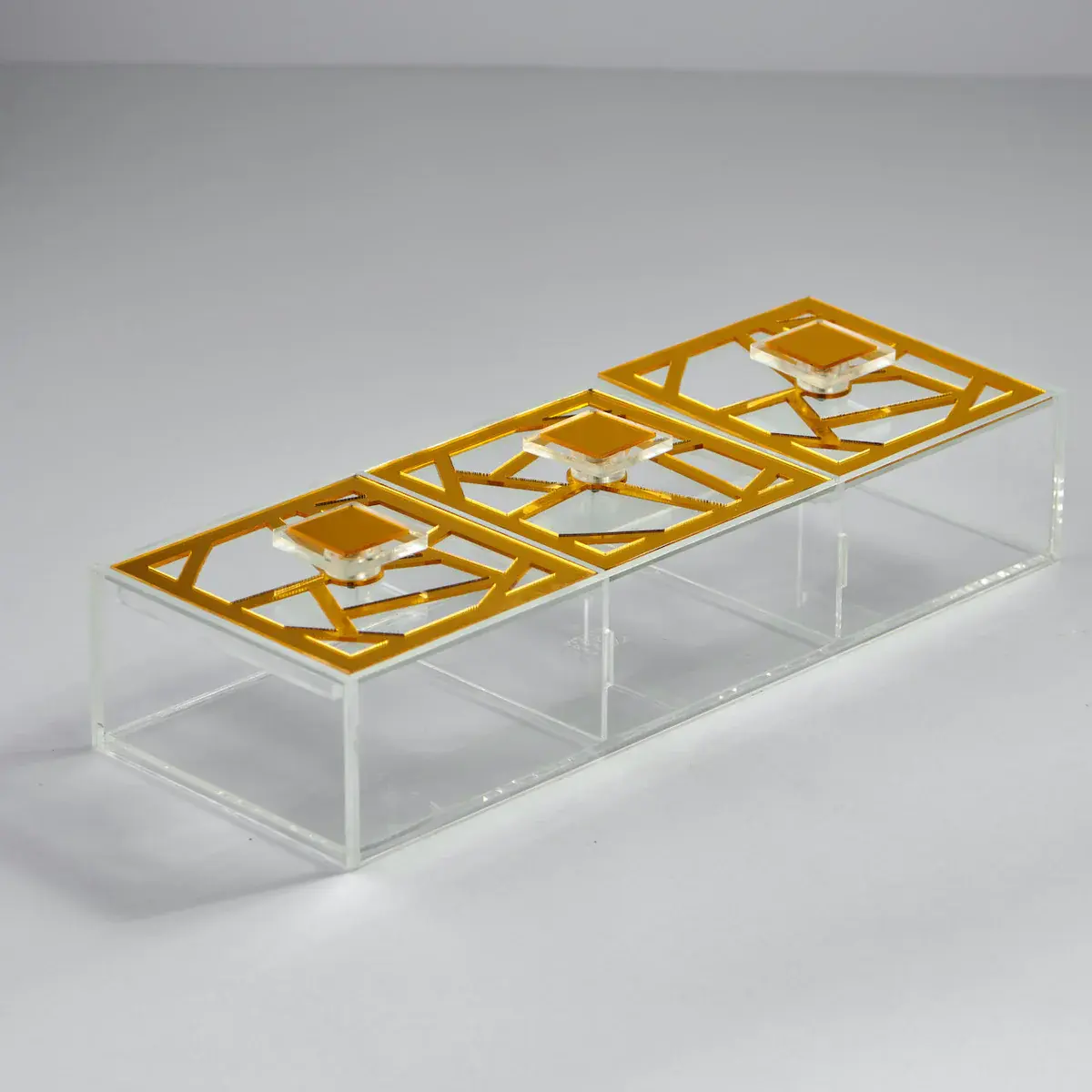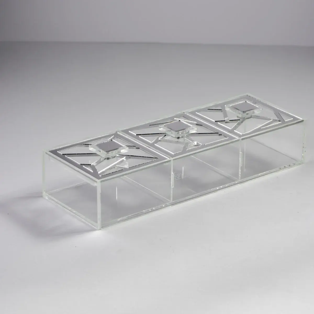 The Irregular Large 3-Compartments Box – 3 Separate Lids by Zee Designs is a refined acrylic storage and serving piece that marries geometric flair with practical luxury. Sized at 36×12×7 cm, the box features an irregular form and includes three individual lids, each covering one compartment. This design provides both visual interest and functional flexibility, letting you open and serve from one section at a time.