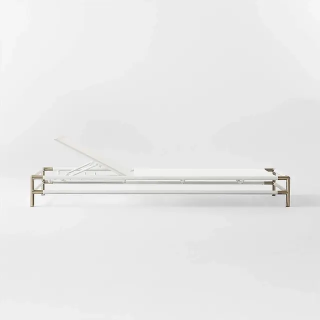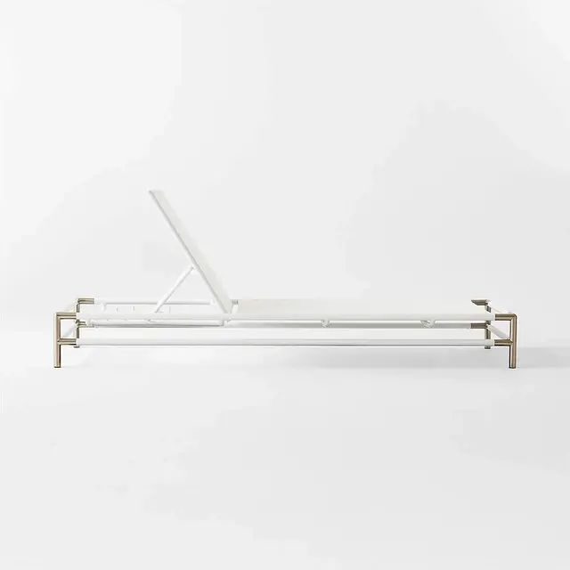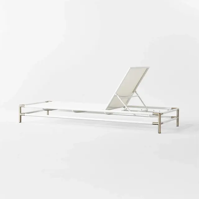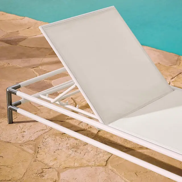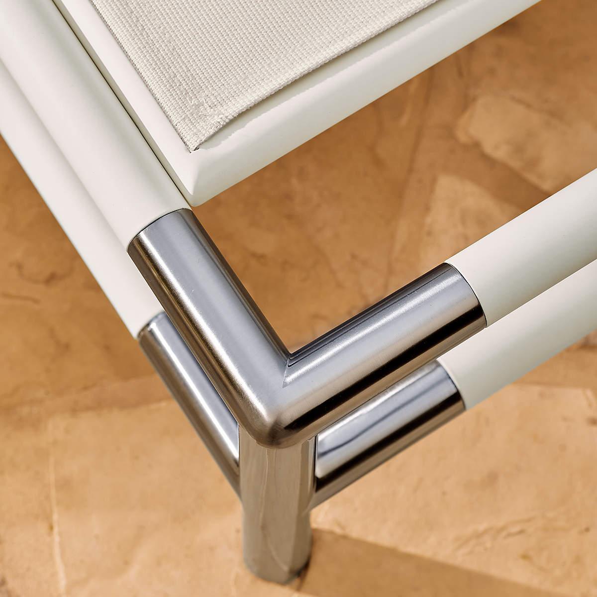 A standout addition to any outdoor space, classic sun lounger by Ceci Thomspon looks light, airy and modern. Rounded stainless steel tube frame is finished with pristine satin white powder coat and polished steel accents that ensure lasting resilience against the elements. Supportive sling seat is fashioned from fade-resistant black performance fabric. Five-position adjustment allows for customized comfort whether sitting, relaxing or entertaining.