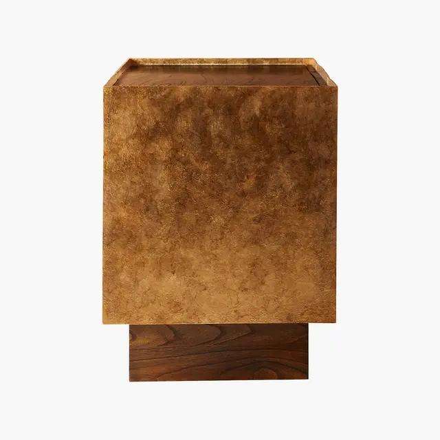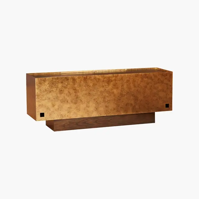 Bronze and gold textured brush strokes mosh across four doors of this handpainted mindi wood credenza. Designed by Mermelada Estudio, the faux-metal sheen brings edge to the piece, rock-solid on a wood plinth base.