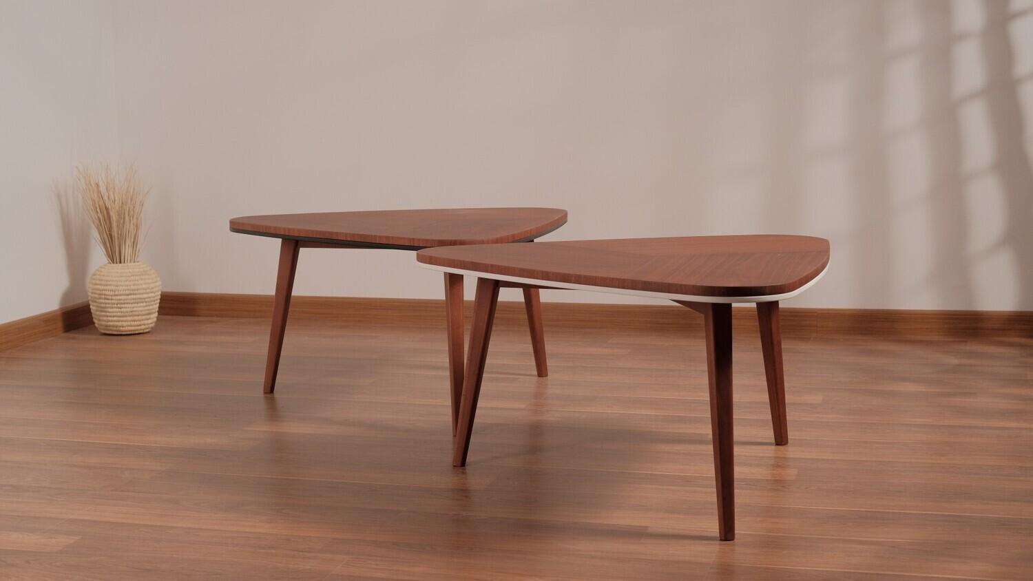 “Kolmio” means triangle in Finish. A two-layer soft triangular table-top, the top layer in cherry wood and the bottom layer in either black or white veneer – mixing the old with the new.
