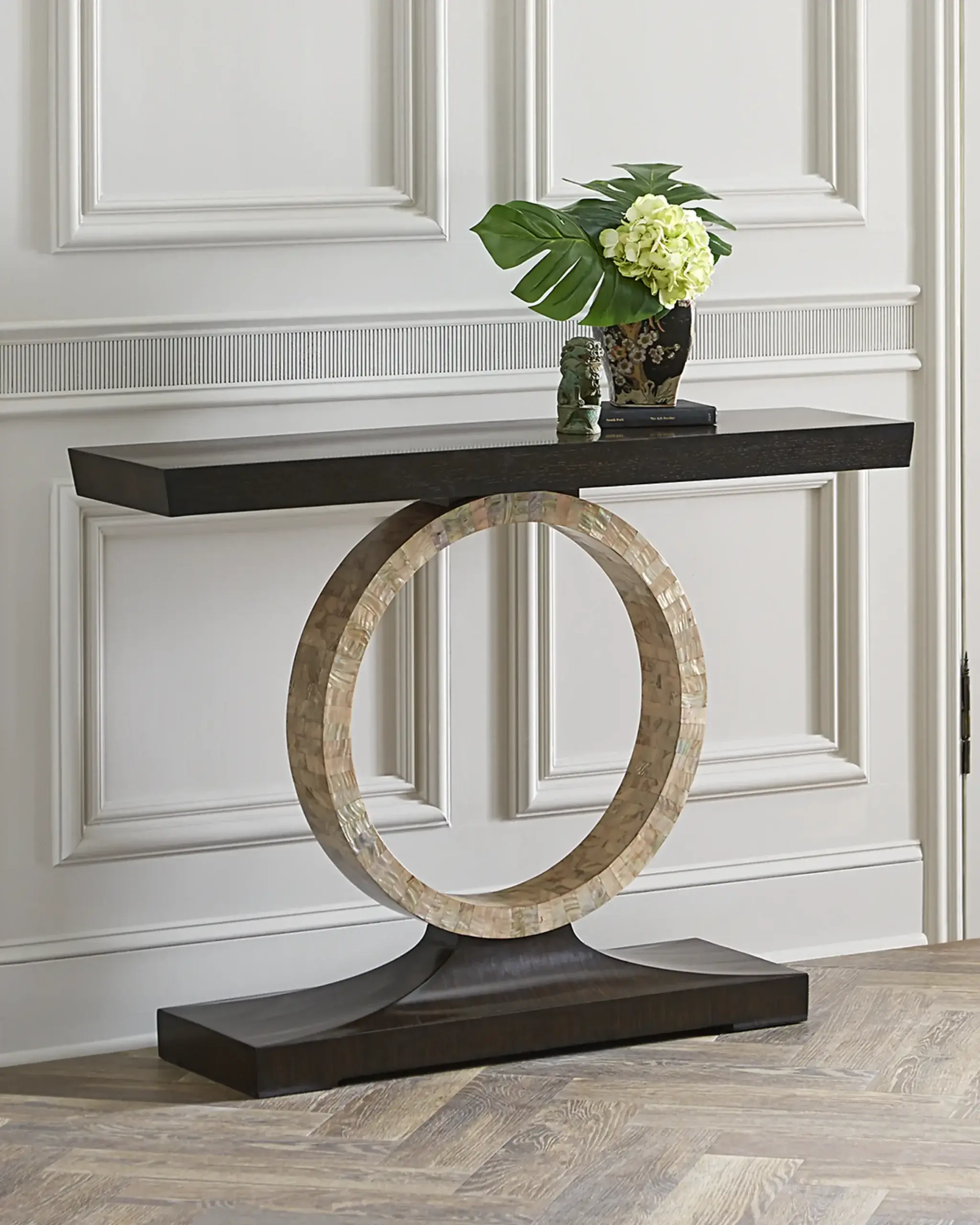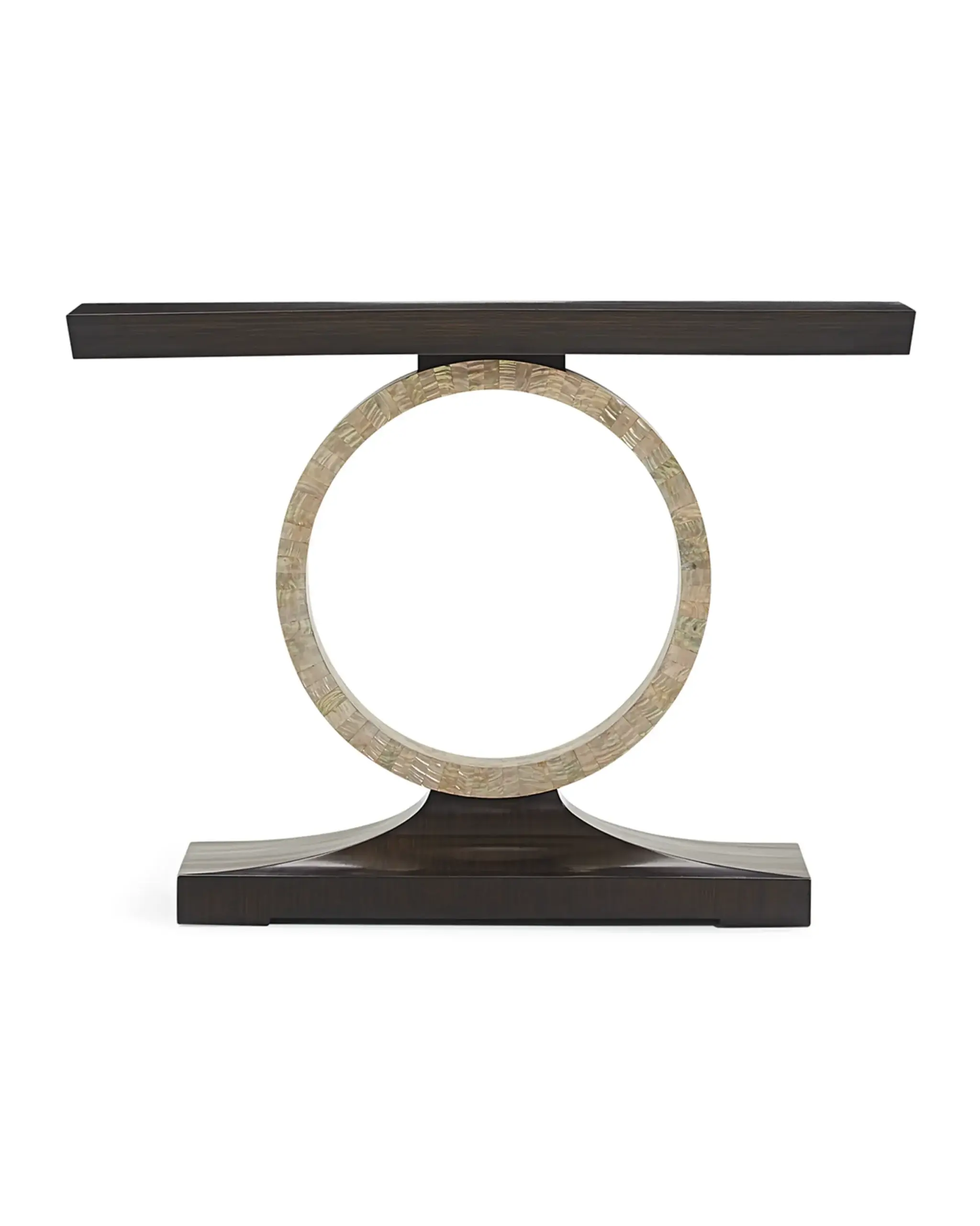 THE LEAGUE CONSOLE TABLE IS a Handcrafted console. Handlaid mother-of-pearl and ebony-finished celtis and wood composite. Measurement : 34 × 135 × 96 cm