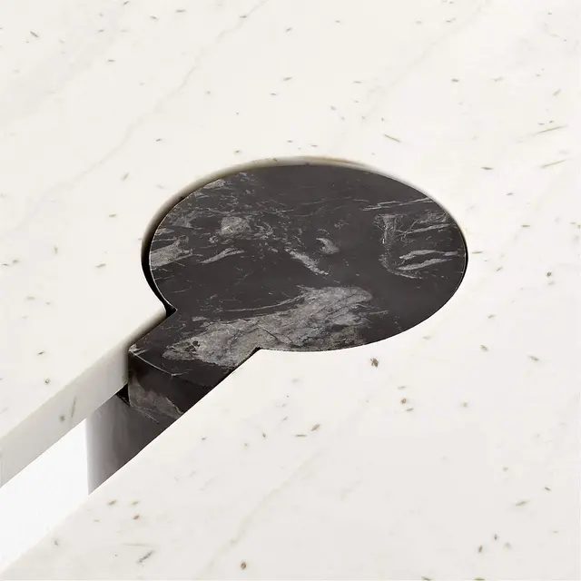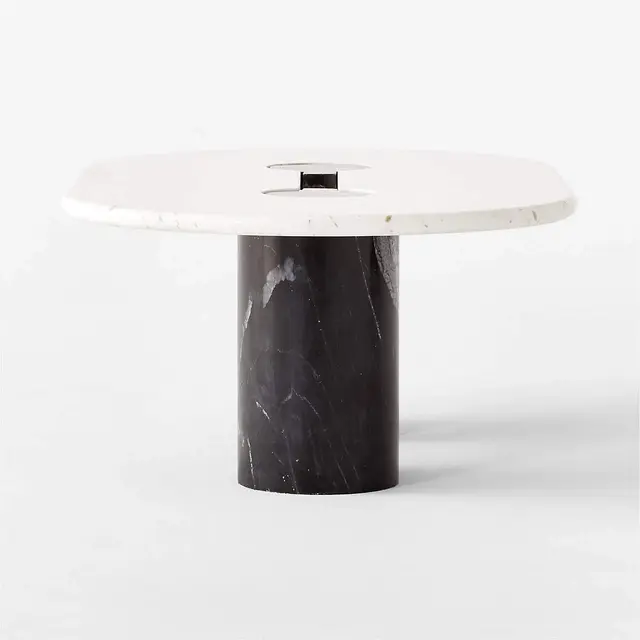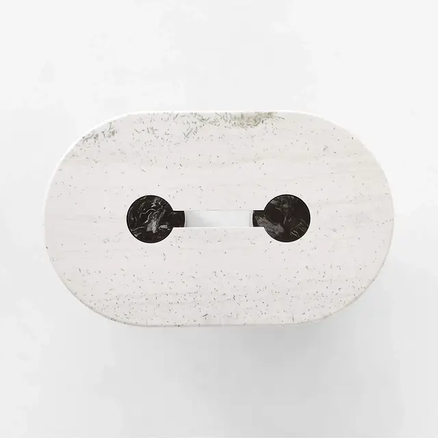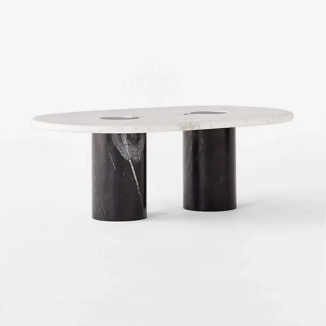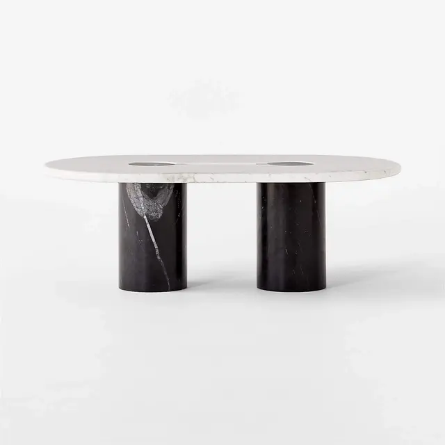 Created by an icon of Italian design, this oval marble coffee table introduces Gianfranco Frattini's mastery of construction to a new generation of design enthusiasts. A solid white Tornado marble top sits atop a richly veined Marquina black marble base, creating a compelling study in contrast. The elegantly minimal structure is created via massive keyhole connections that are self-supporting and interlocking. Conceptually very simple and aesthetically unique, this marble coffee table's striking silhouette is at once contemporary and timeless.