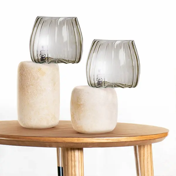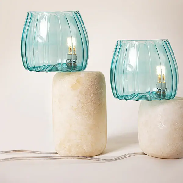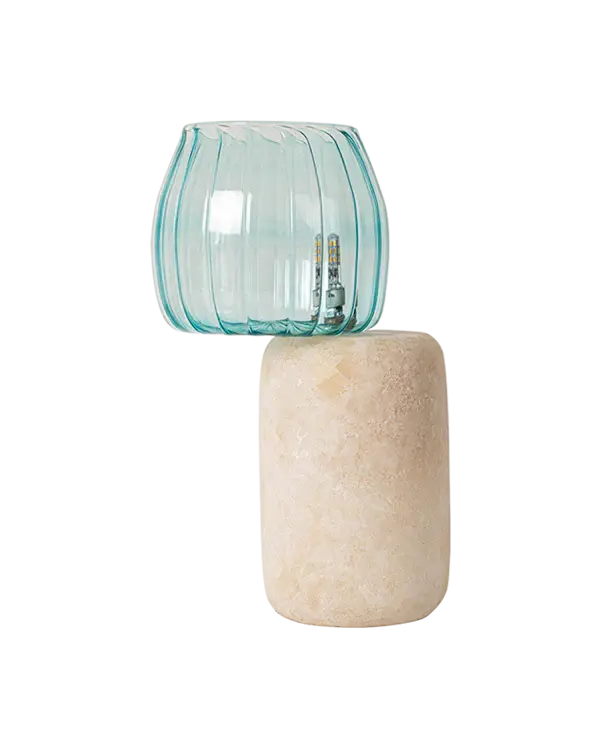 Lotus side lamp aims to integrate into a harmonious and relaxed environment compatible with all types of indoor spaces. It seeks to generate a welcoming state wherever placed, adding warmth and timelessness around it. The lotus blossom is a spiritual symbol of the Ancient Egyptian culture that symbolizes beauty, strength and power. The LOTUS Side Lamp, Handcrafted from soft alabaster attached with a clear light blue glass chapeau.