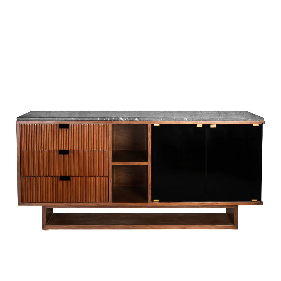 Lucent has a pure and elegant shape that creates a refined and pleasing design. It combines a wooden frame board with louvered like set of drawers, shelves and tinted glass with pietra grey marble on top.