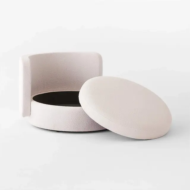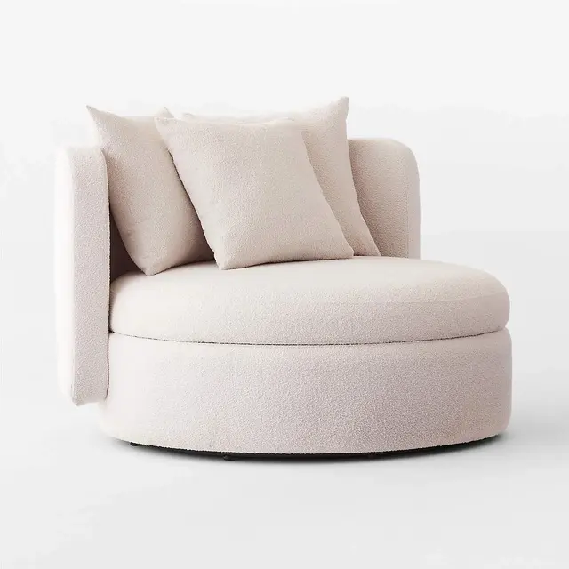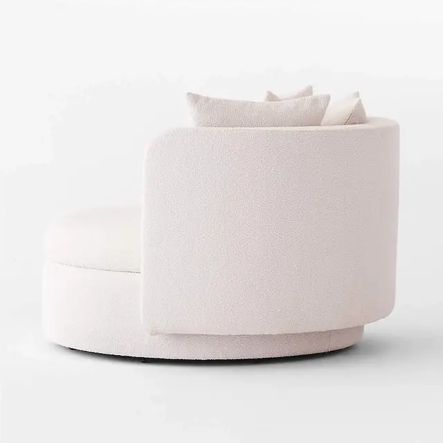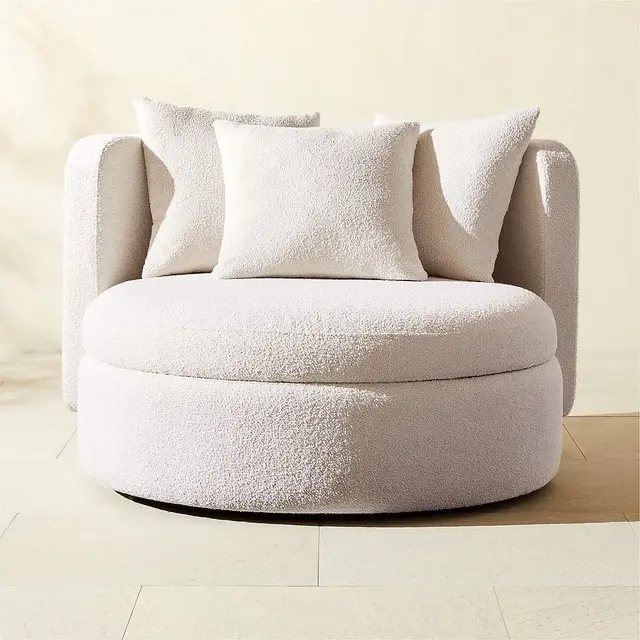 Outdoor swivel chair by Gonçalo Campos reimagines the look of outdoor lounging. Generously proportioned and accessorized with three throw pillows, it has hidden storage beneath the removable seat. Wrapped in an all-weather solution-dyed boucle, it's a comfortably chic place to while away sun-drenched afternoons or starlit evenings.