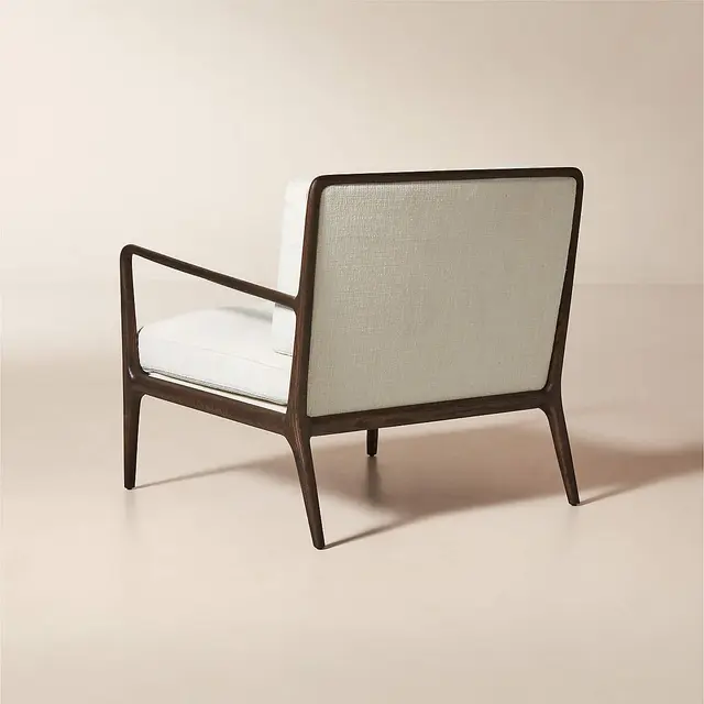 Hand-assembled accent chair by Mermelada Estudio balances a slim, curved wood frame with a cushion wrapped in highly textured, easy-to-clean performance fabric. Red oak frame, sports steam-bent arms shaped at a tight radius for an impossibly thin form. The chair's streamlined silhouette pairs perfectly with the warm, organic feel of the materials to create a seating that's equally comfortable and sophisticated.