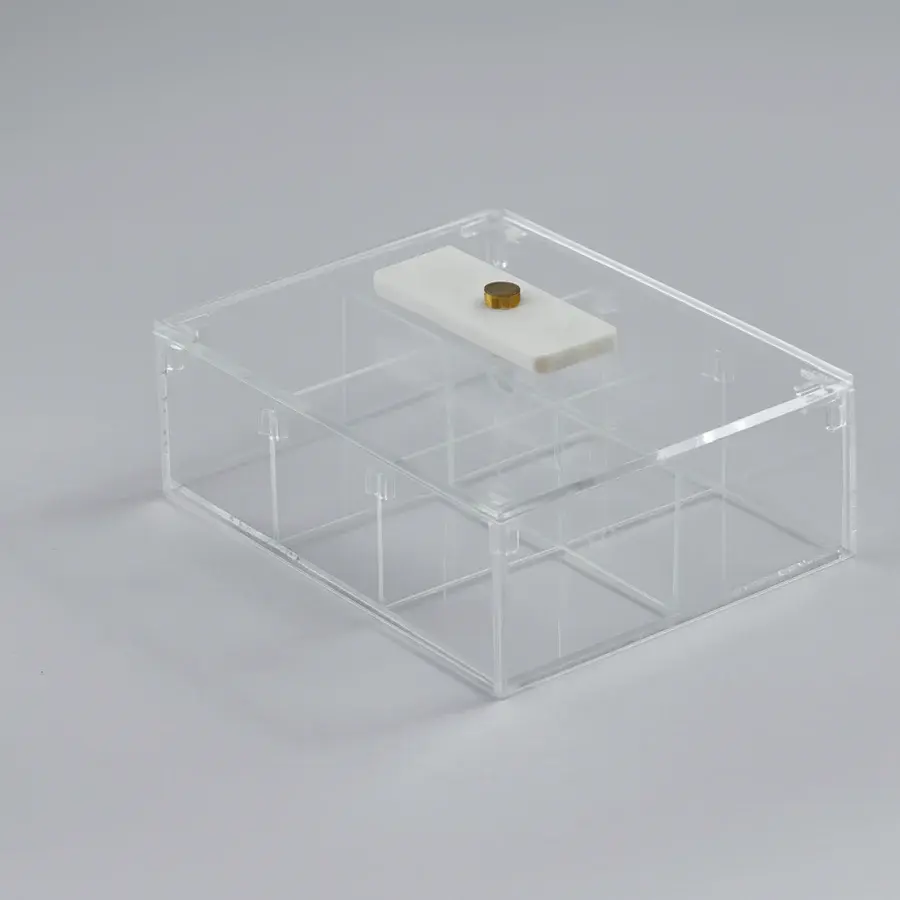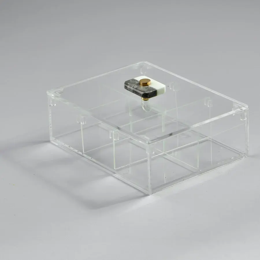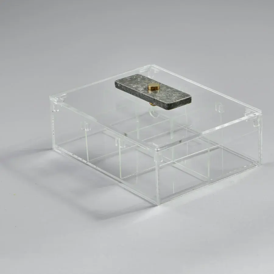 Made with durable clear plexiglass for a clean and modern appearance, this box measures 22 x 16 x 8 cm, fitting seamlessly on vanities, countertops, or even inside drawers. The design is elevated by your choice of five sophisticated marble knobs, including Beige & White, Grey & White, White, Beige, and Grey. Whether you’re decluttering or adding a premium touch to your home décor, this product offers an elegant and functional solution