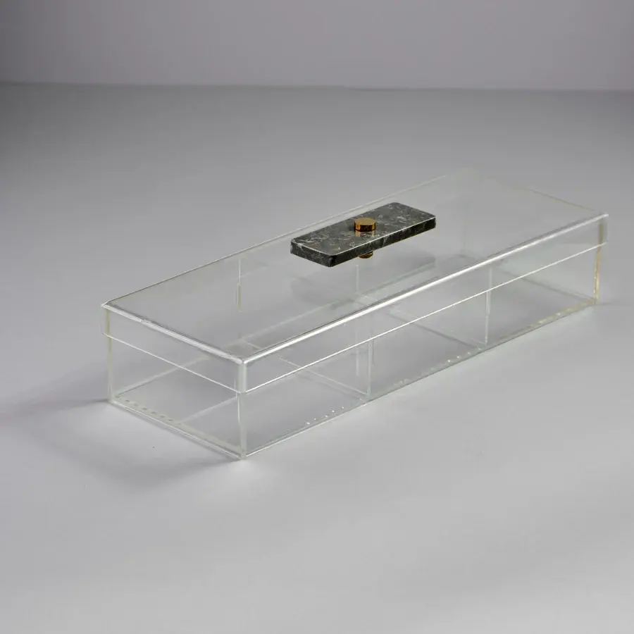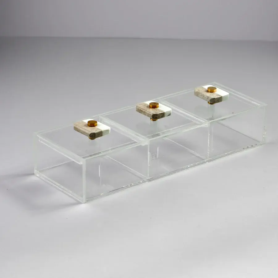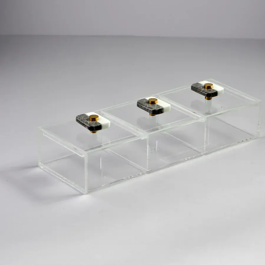 Elevate your everyday storage with our Marble Trio-Lid 3-Compartment Rectangular Box, a signature piece from Zee Designs’ Marble Collection. This elegant box is crafted from thick, transparent acrylic and features three individual lids, each adorned with a genuine marble knob secured by a thick, rich brass bolt for added sophistication and durability.