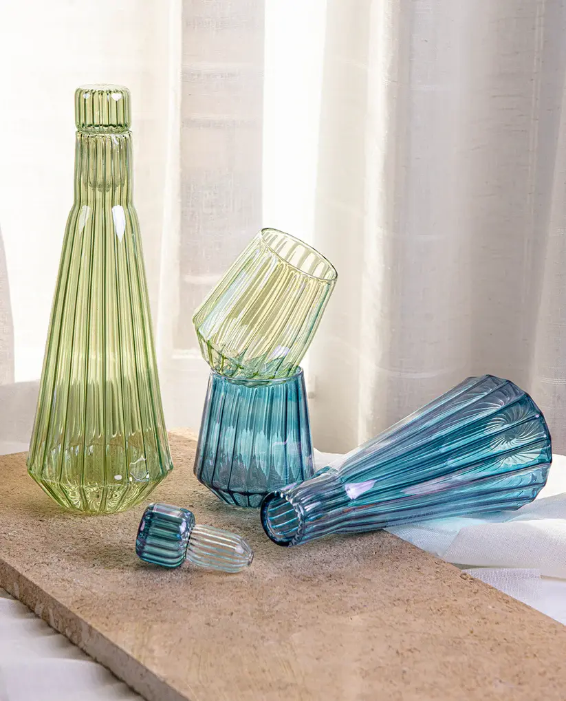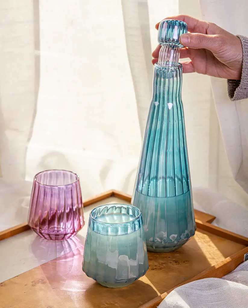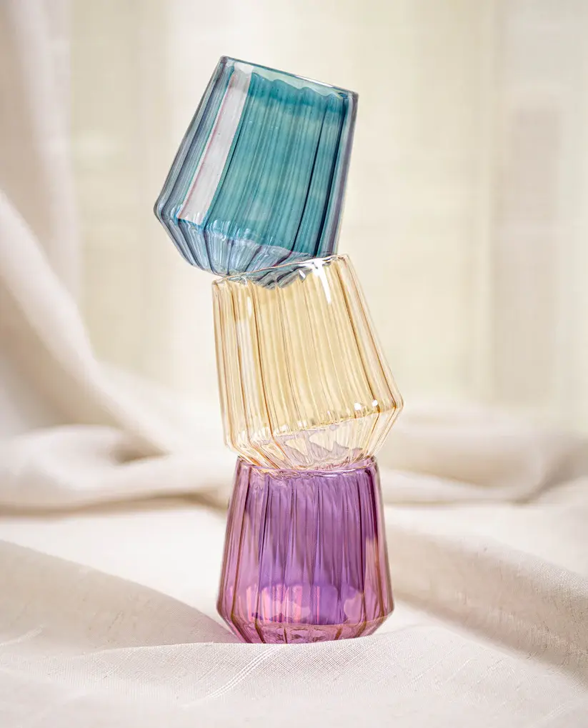 Embrace the tradition of saying Ya Marhab and make your visitors feel truly welcomed. Description: Marhab handmade drinking glass, from Kelos borosilicate glass. Enjoy your favorite beverages with style with this handmade drinking glass made from Kelos borosilicate glass. This sophisticated and stylish glass is perfect for everyone without compromising on quality. Colors: Blue - Yellow - Green - Purple Dimensions: H 12cm Material: Kelos borosilicate Glass
