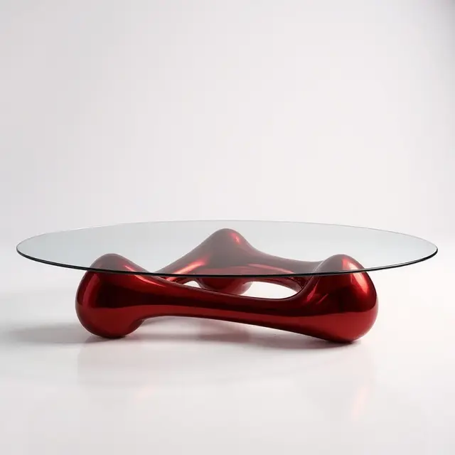 Mars Coffee Table by Wajdi Zoghbi, designed for Eirems. A striking piece features a sculptural futuristic base with a wine red finish, evoking the organic forms of nature. Mars Table design combines fluid lines and dynamic shapes, creating a captivating focal point for any living space. Topped with a sleek glass surface, the table harmoniously balances aesthetics and functionality. Perfect for modern interiors, the Mars Coffee Table invites conversation while providing a stylish spot for your favorite books and beverages. Elevate your décor with this unique blend of art and design.