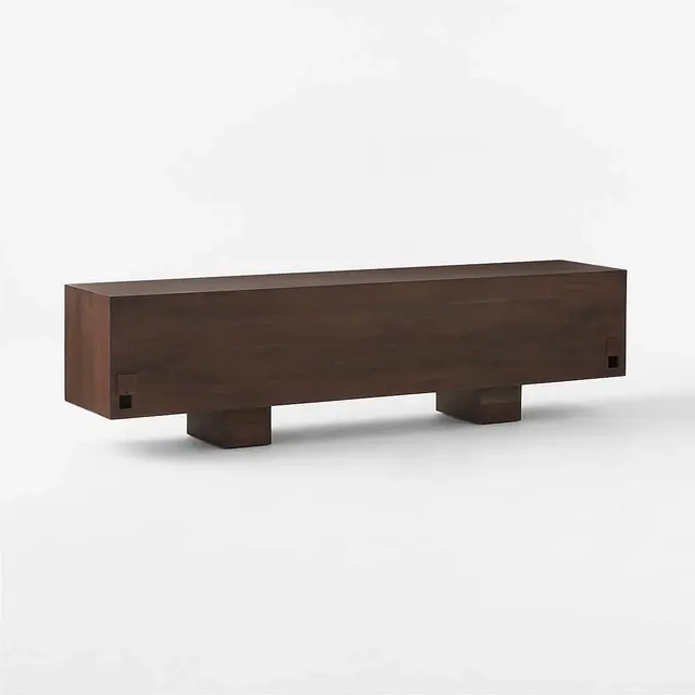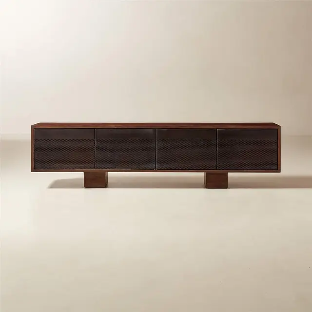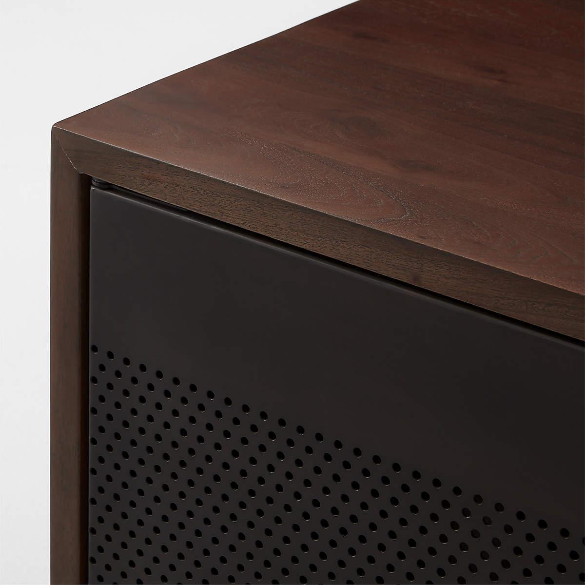 A well-balanced mix of materials comes together in this low media credenza by German designer Jannis Ellenberger. "The simple geometric forms of the Martinez credenza make it a statement piece—immovable and steadfast," explains the designer. Elevated on solid wood feet, dark-stained acacia wood provides a refined contrast to four blackened stainless steel doors.