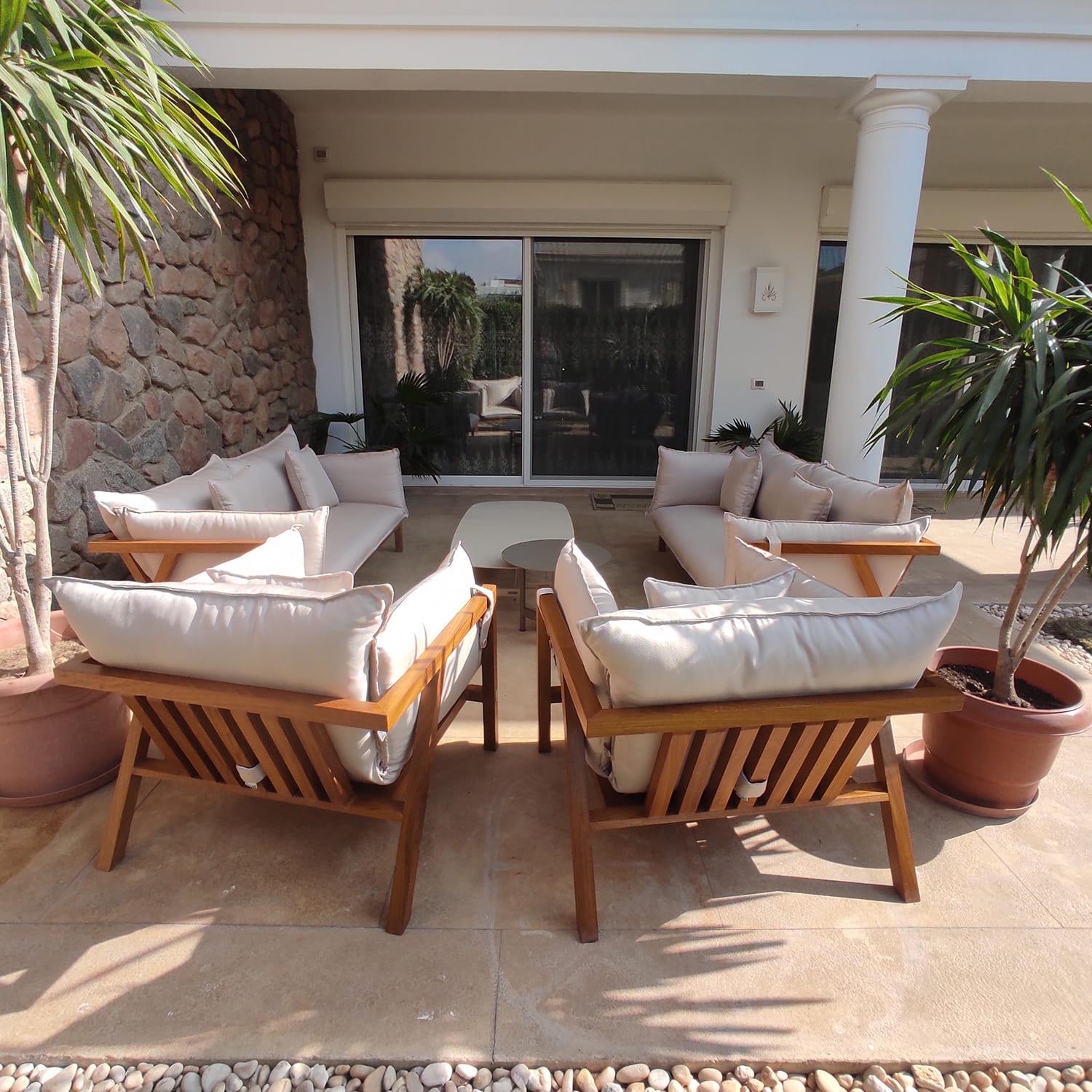 Materials: Teak wood, Waterproof fabric, Sun-resistant fabric