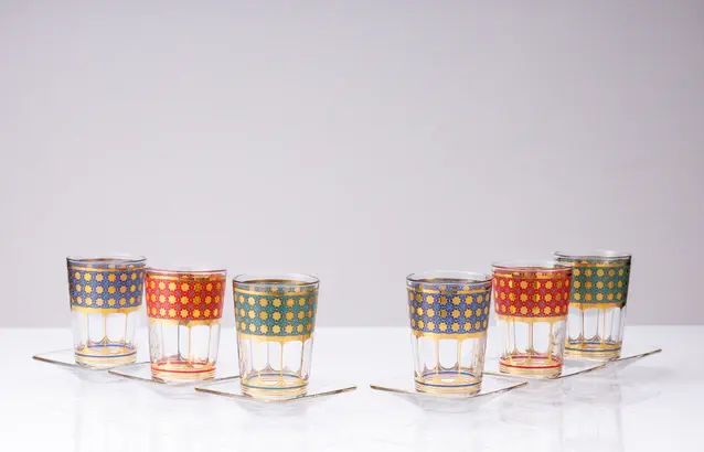 Take your tea and coffee drinking experience to the next level with Mindada's Moroccan series! A gold-pattern tea set that consists of 6 tea glasses and 6 saucers. IP-99237-81-156653