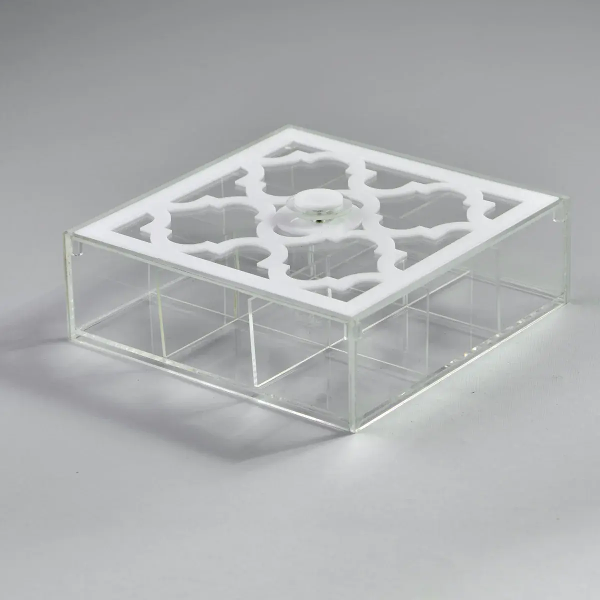 The Moroccan 9-Compartments Teabox by Zee Designs is a beautifully structured piece that brings cultural flair to your daily tea ritual. Made from clear plexiglass, this square box features a decorative lid with a Moroccan-inspired motif and is available in White, Turquoise, Silver, and Gold finishes. Inside, nine equally sized compartments keep your tea sachets, coffee capsules, or wrapped sweets neatly organized.