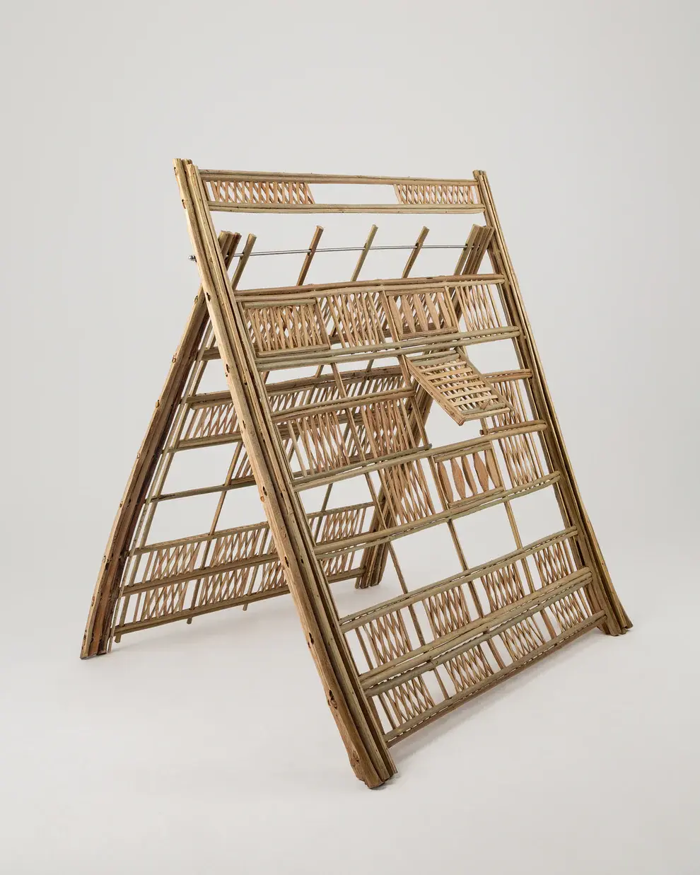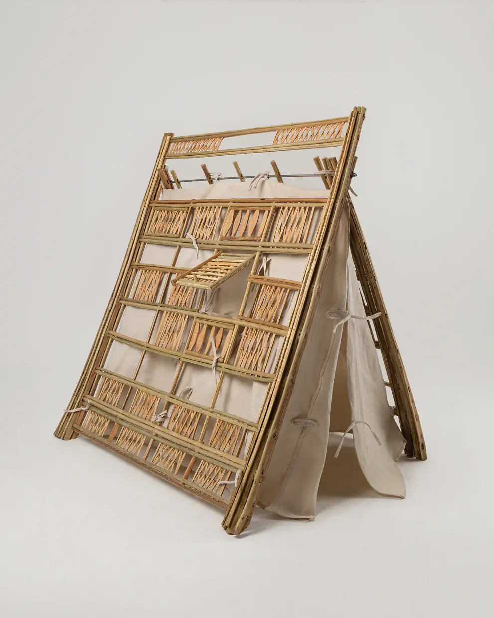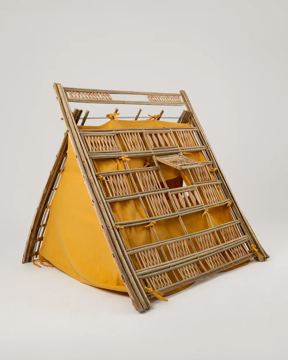 "Nawa" tent is a joyful and safe haven for children to come together, play, and dream. The name of a date kernel is inspired by the concept of seeds in general that sprout and blossom into a source of nourishment and vitality. Like a conventional tent, “Nawa” is supported by two flanking panels, each made of intricate patterns of traditional reed crafts lined with softer fabric and folds, creating a place for children to contemplate their intimate space and imagine bigger worlds.