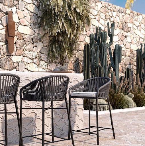 The Olema bar stool deftly mixes eye-catching design with weather-friendly materials.
