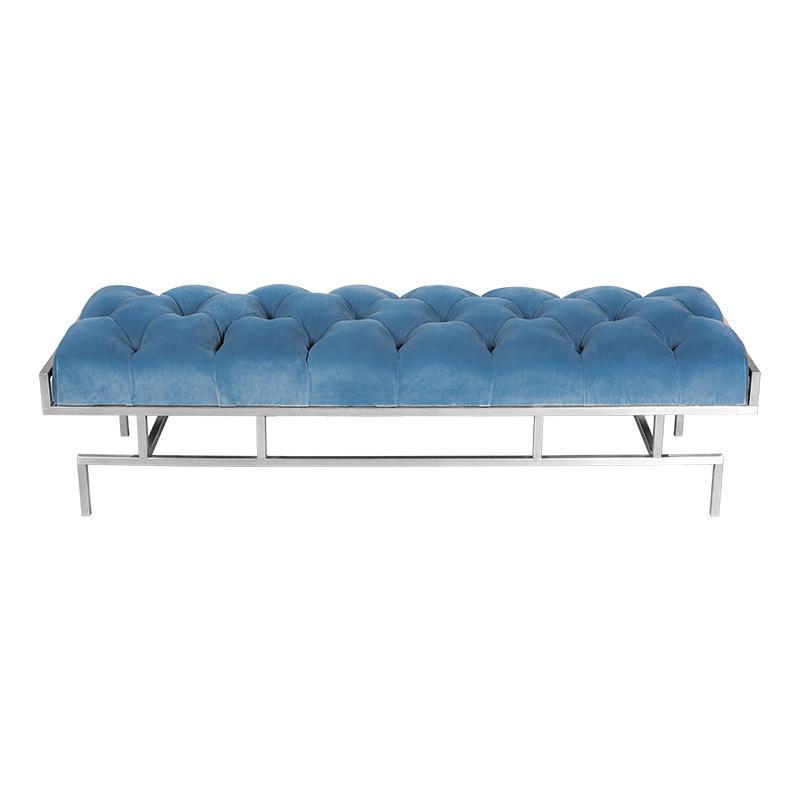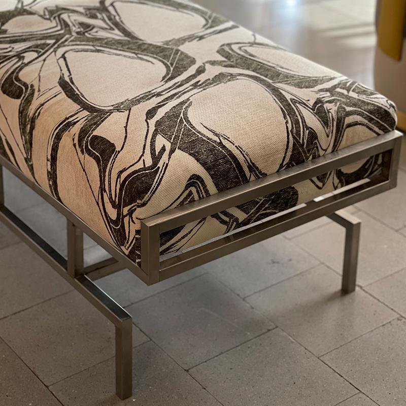 A banquet that comes with stainless steel legs and an upholstered seat