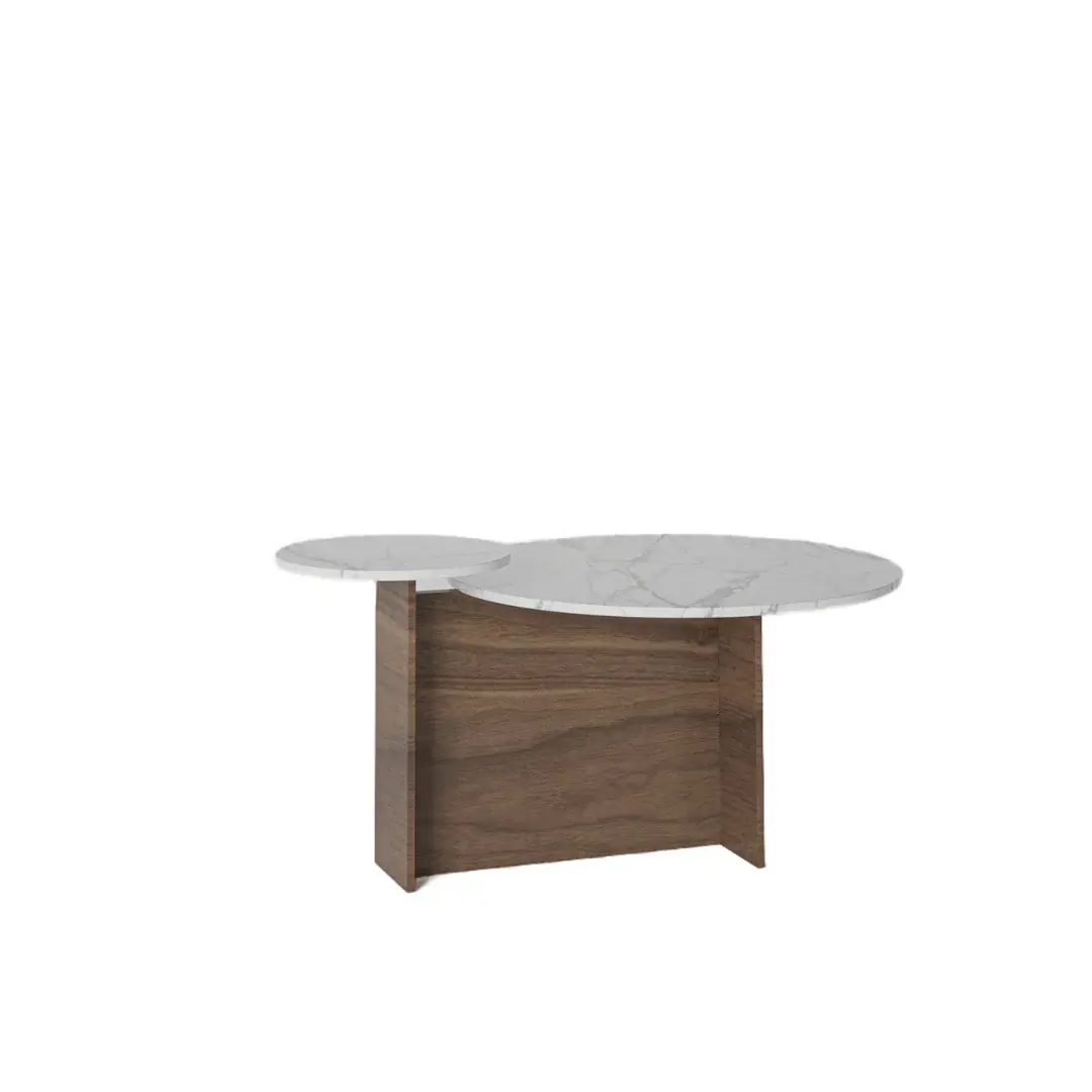 It is a minimally designed coffee table, perfectly rounded and symmetrical with two different-sized Carrara marble tops, featuring the smaller-sized marble on top and the bigger-sized one underneath. Table stands on a wooden structure.