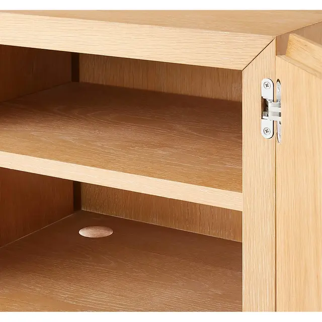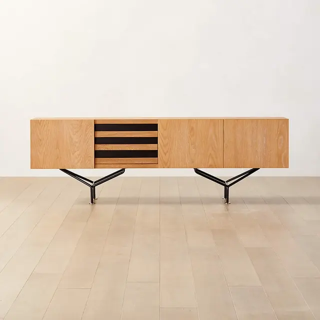 Designed in 1954, its silhouette embraces the clean lines and decisive angles characteristic of midcentury modernism. Frattini's respect for fine woodworking is honored through a white cerused oak finish. Three drawers in ebonized black oak pull out on smooth wood drawer glides while three cabinets open to reveal adjustable shelves. Set atop sleek black powder-coated legs, this midcentury credenza handles the details with finesse, down to the champagne brass of its feet.