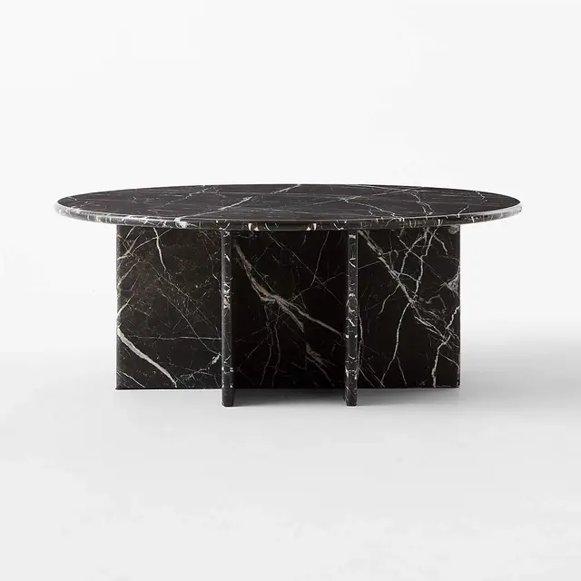 Crafted with highly active black Saint Laurent marble, coffee table by Ceci Thomspon incorporates geometric design elements for a stunning silhouette. The marble's dynamic white veining and striking tones of cocoa and copper give it mesmerizing allure, and the variation inherent to natural stone ensures that no two tables will be alike.
