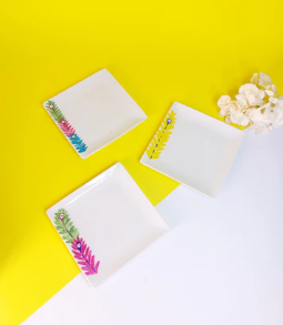 Set of 3 porcelain dessert plates with colorful hand-painted peacock feather motifs.