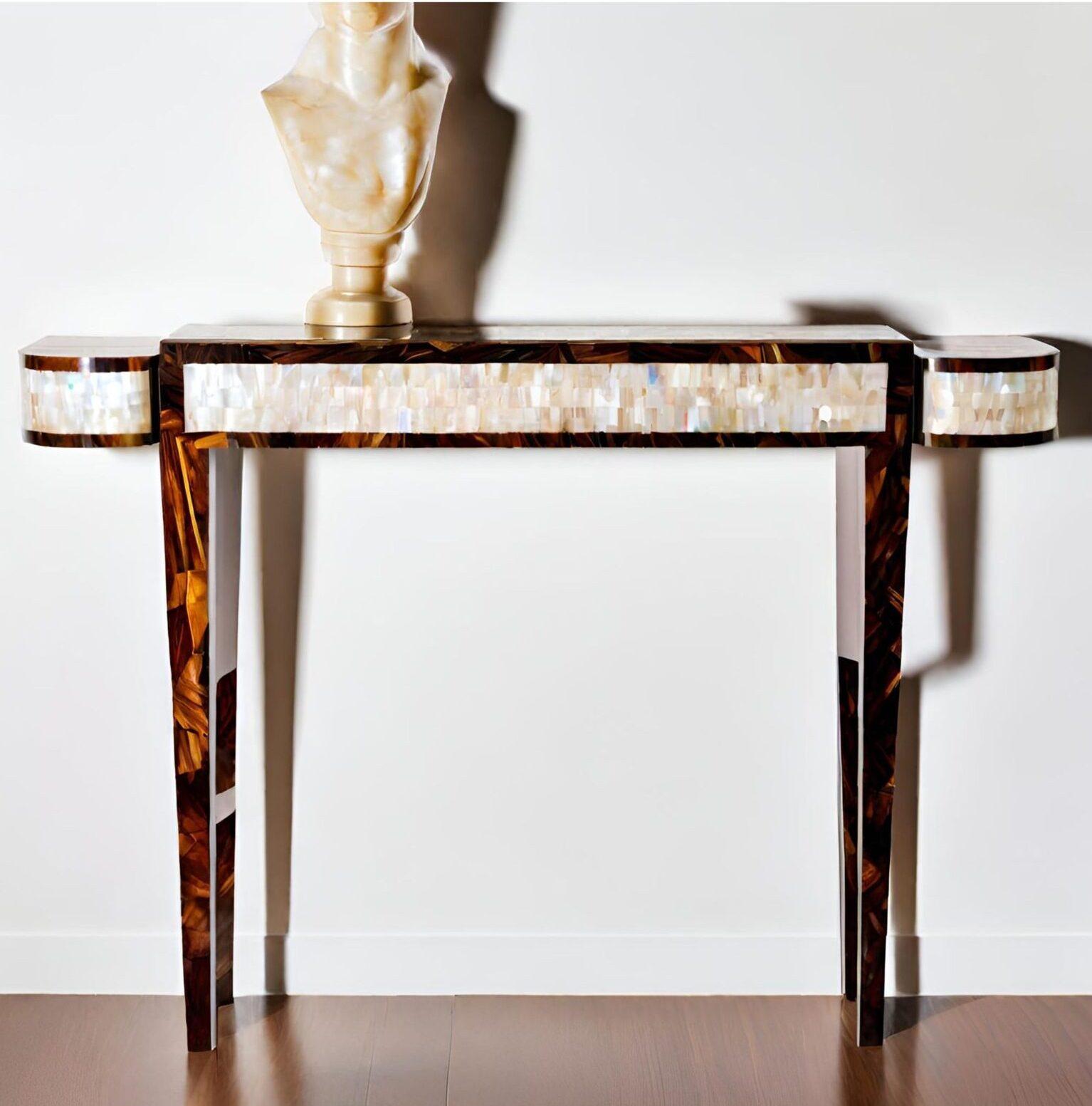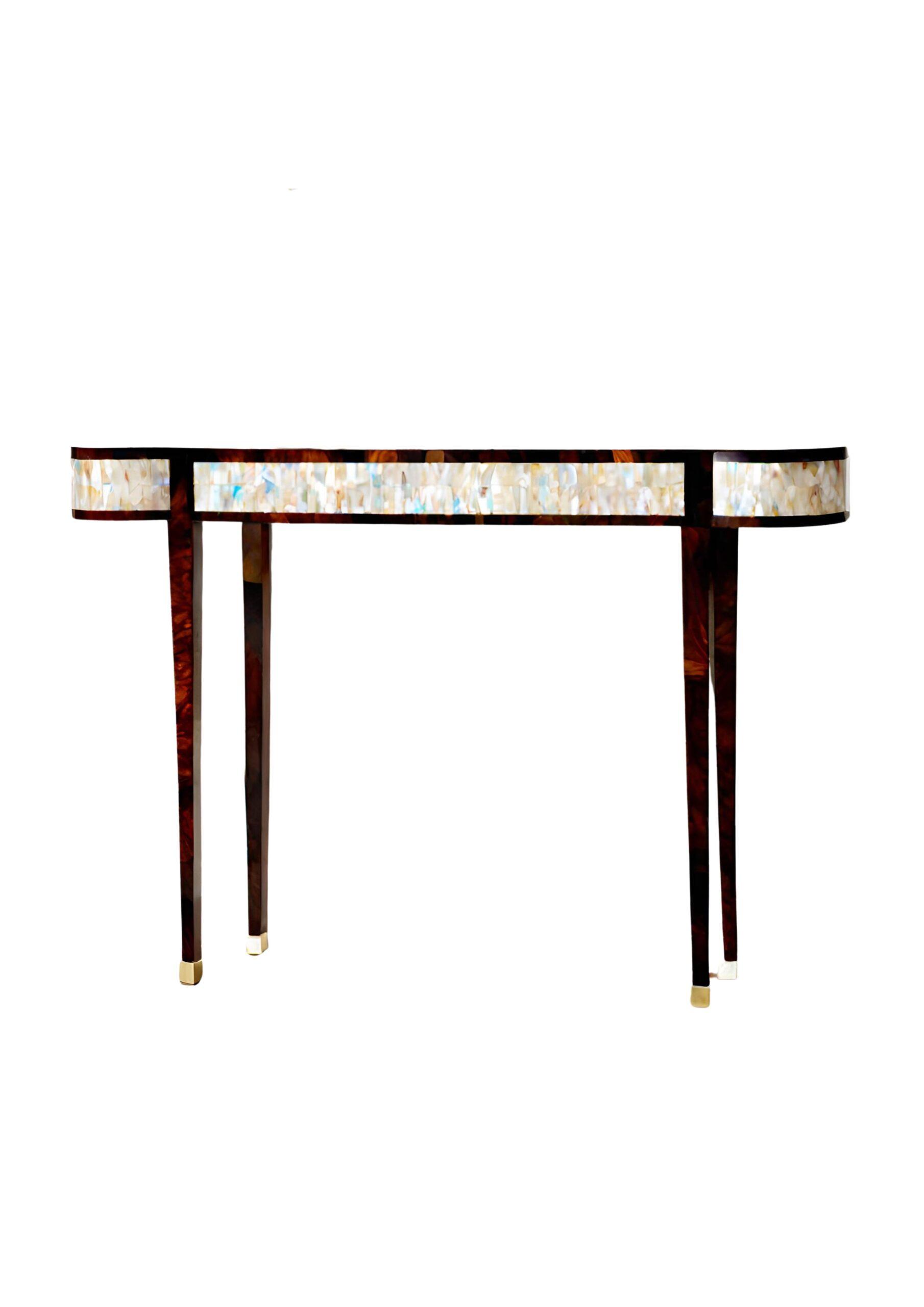 This console table, with its spectacular mother-of-pearl , creates a dramatic silhouette. It is finished in ebony veneer.
