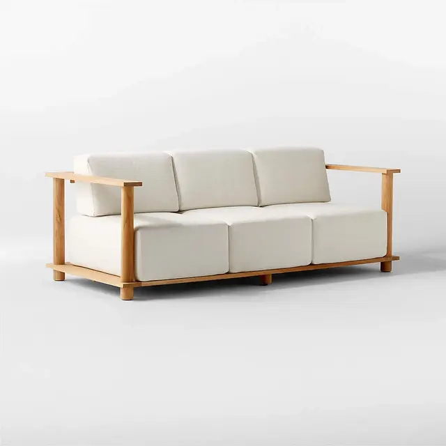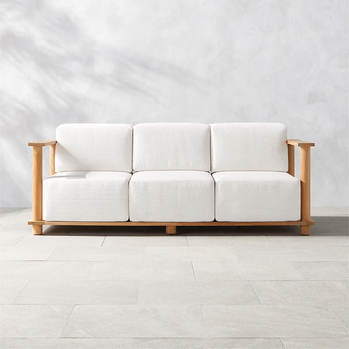 Loosely inspired by the seaside glamour of a famed cliff-top hotel in Tuscany, outdoor sofa by Ross Cassidy brings effortless European sophistication to the out-of-doors. Refined, straightforward silhouette has solid turned teak legs and armrests intentionally sized to hold a drink. Oversized removable cushions, upholstered in a soft and striated textured ivory performance fabric, are foam-filled to accommodate hours of lounging. Cassidy calls teak, valued for its tendency to weather to a gorgeous silvery-grey patina over time, the "quintessential" outdoor material. Pinet is crafted with Grade A teak—the highest-quality teak available, prized for its uniform tone and strength.