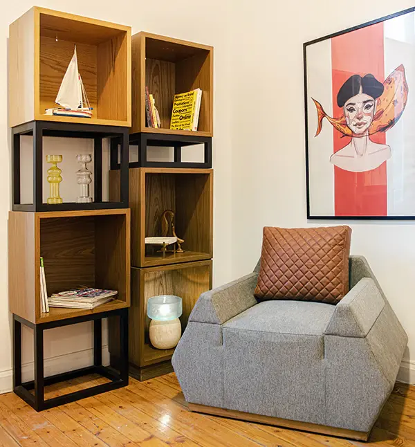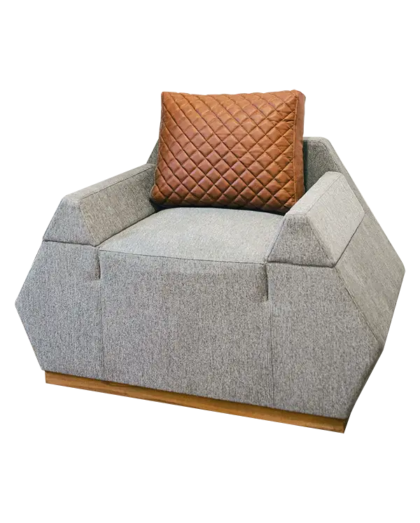 Fully upholstery armchair with wooden skirting and leather cushion in patuné technique. This fully upholstered Pyra armchair is reviving Ancient Egyptian heritage in a way that fits the modern life. It takes inspiration from the past to create a new future and identity. Wood, fabric and leather are combined to express opulence. While the contrast of texture communicates the luxury and the causality of the piece that combines function and art. Material: Fabric, leather and wood Dimension: Width 116 cm – Depth 77 cm – height 68.5 cm Colors: Havane & Grayish Delivery time : 6-8 weeks