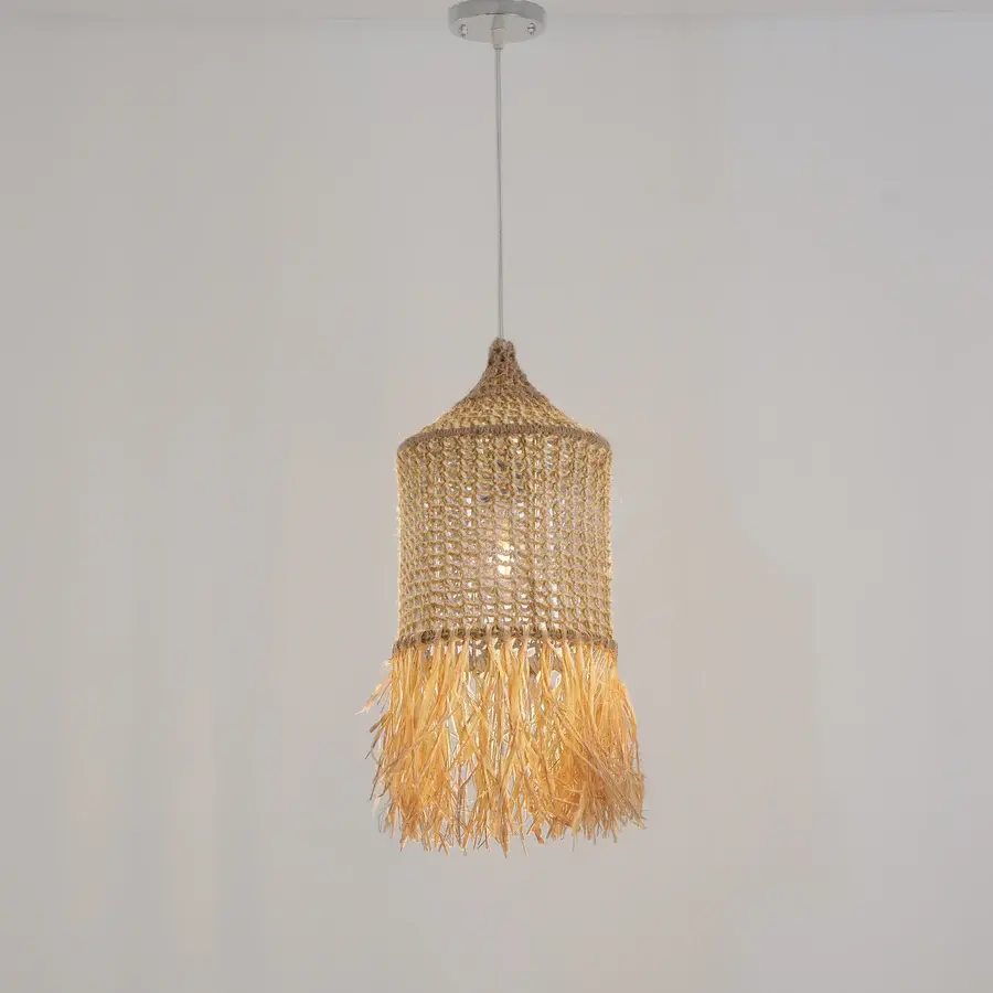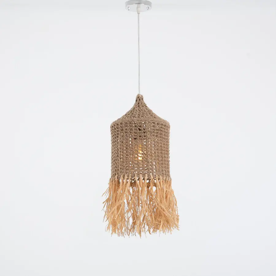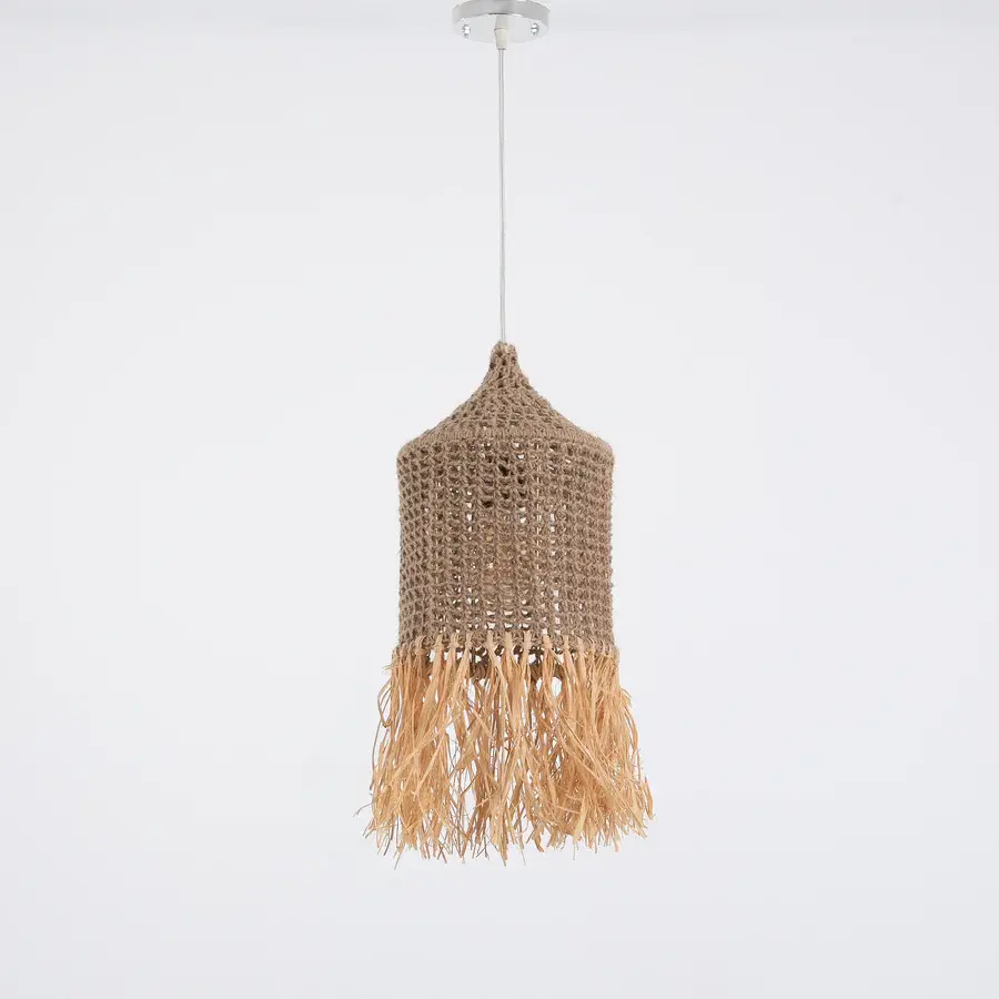 The perfect woven hanging lamp with a fringe to add a touch of elegance to any space. This unique lamp features a beautifully crafted woven design that creates a warm and inviting atmosphere. The fringe adds a playful and stylish element, making it a statement piece in any room. Illuminate your space with FringeGlow and let its soft glow and intricate details enhance your decor.