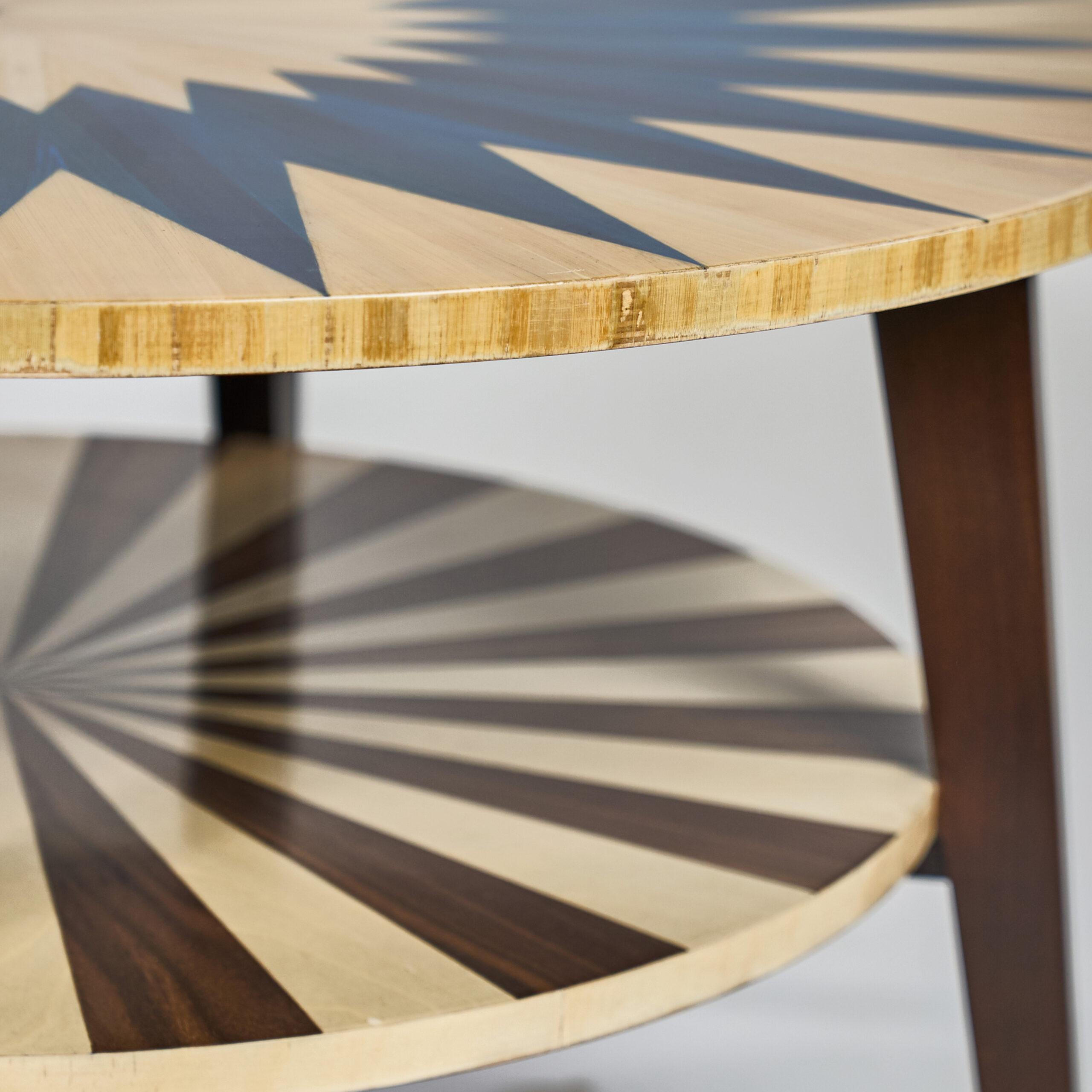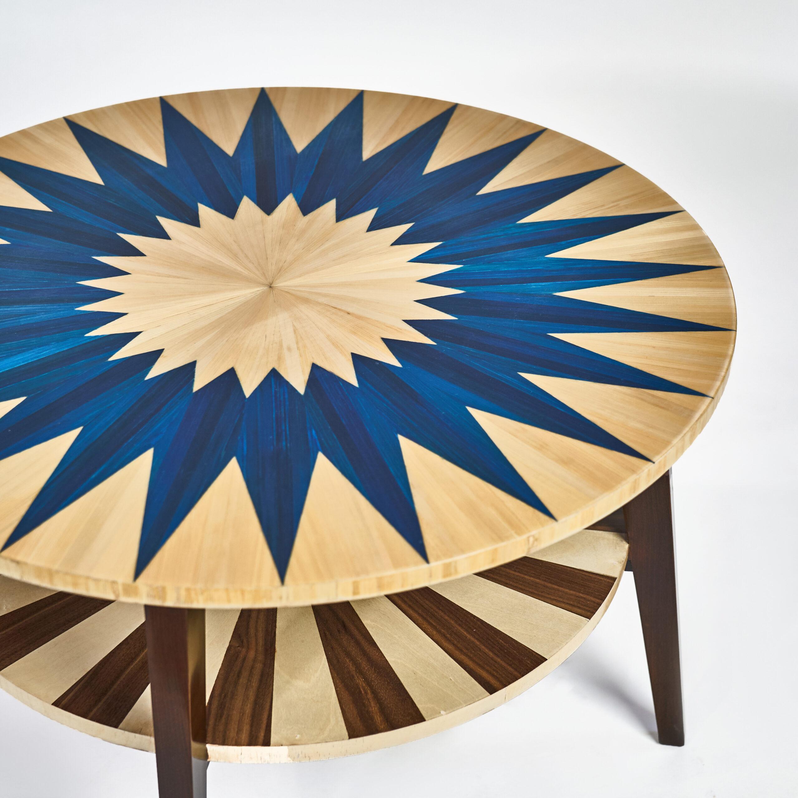 A new creative design for a coffee table with two levels. The designer uses a straw marquetry at the top level with blue and golden colors, and made art at the second level with two-tone veneer. The design is inspired by the bright rays of the sun, which give vitality.
