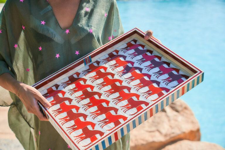 Highest quality of wood with glossy finish inlaid with mixture of mother of pearl and acrylic Measurement : 33 * 46