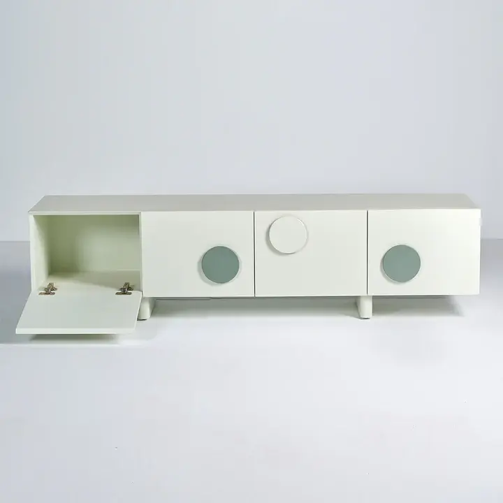 A stylish sideboard adorned with circular shapes and various shades of green. Crafted from quality materials, it exudes durability and sophistication, with a sleek silhouette that enhances its modern appeal. Offering ample storage space, it becomes a versatile focal point in any room, adding elegance and personality with its unique circular design and refreshing green tones.