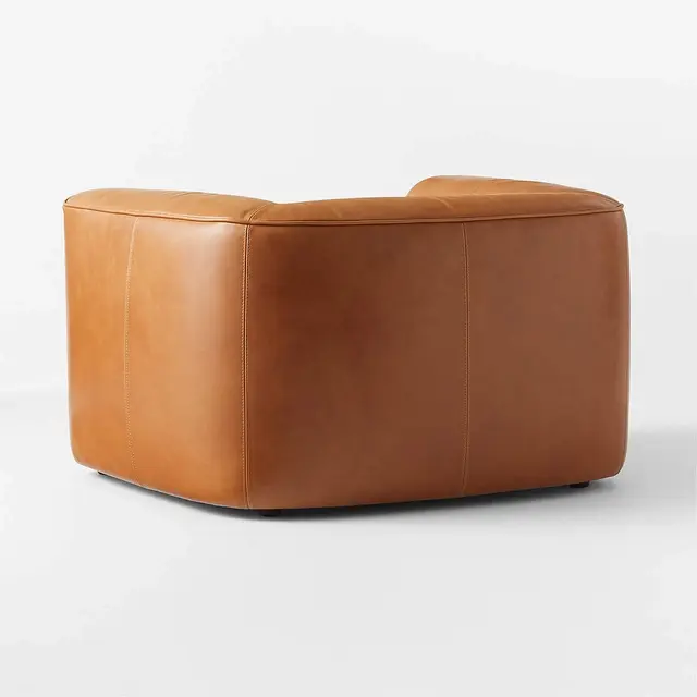 Low-slung leather chair by Studio ANANSI is a modern classic. Featuring a welt trim along the perimeter, the oversized frame is wrapped in full-grain leather with a delicate ruched detail. Crafted by a third-generation tannery, the hand-stained leather upholstery is individually selected for its inherent markings and characteristics for a naturally worn-in aesthetic.