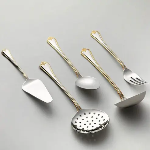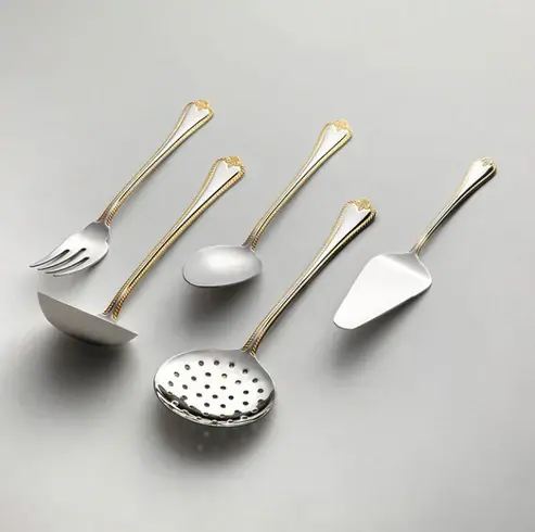 Brighten up your dining with our 89-piece stainless steel cutlery set. The golden decorated handles bring a touch of glam, perfect for fancy occasions. No more unmatching utensils - elevate your table with this stunning and useful set.