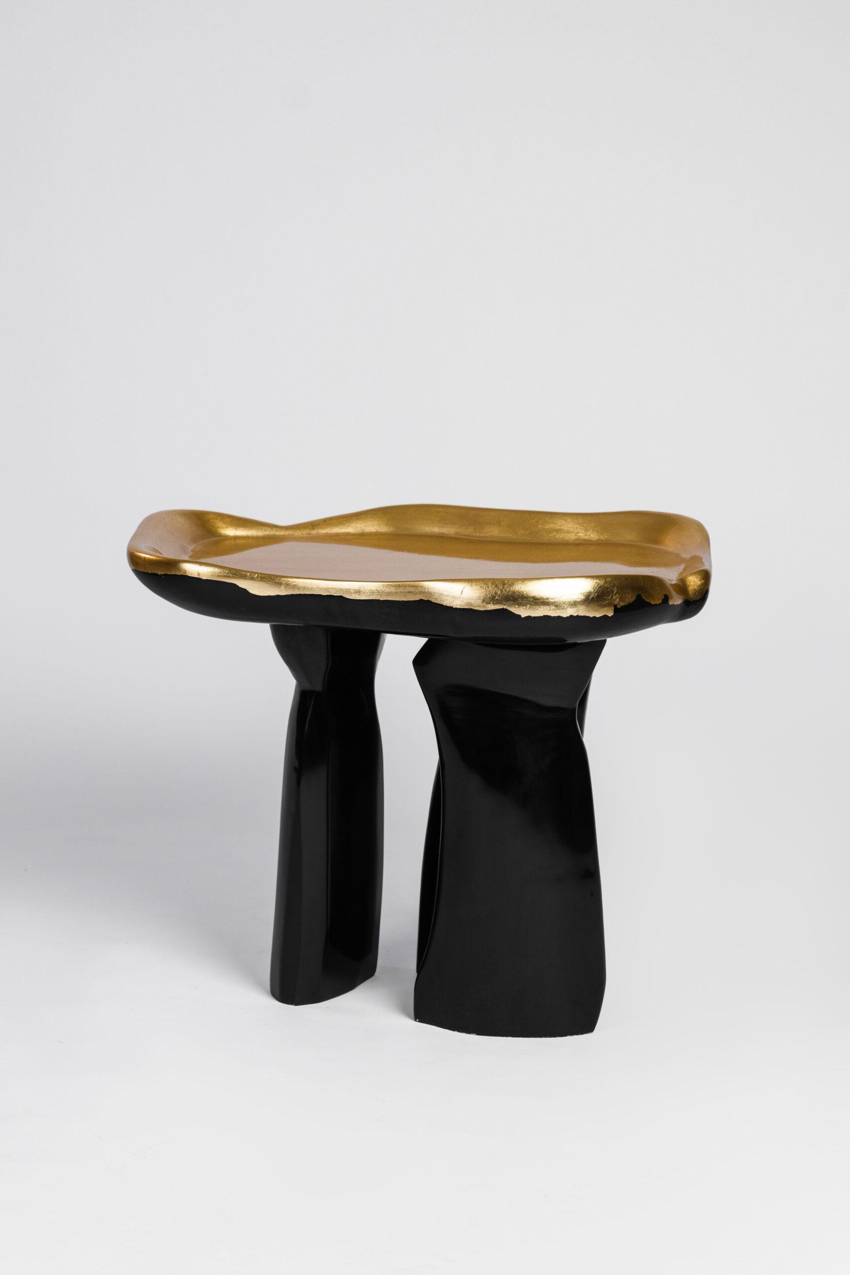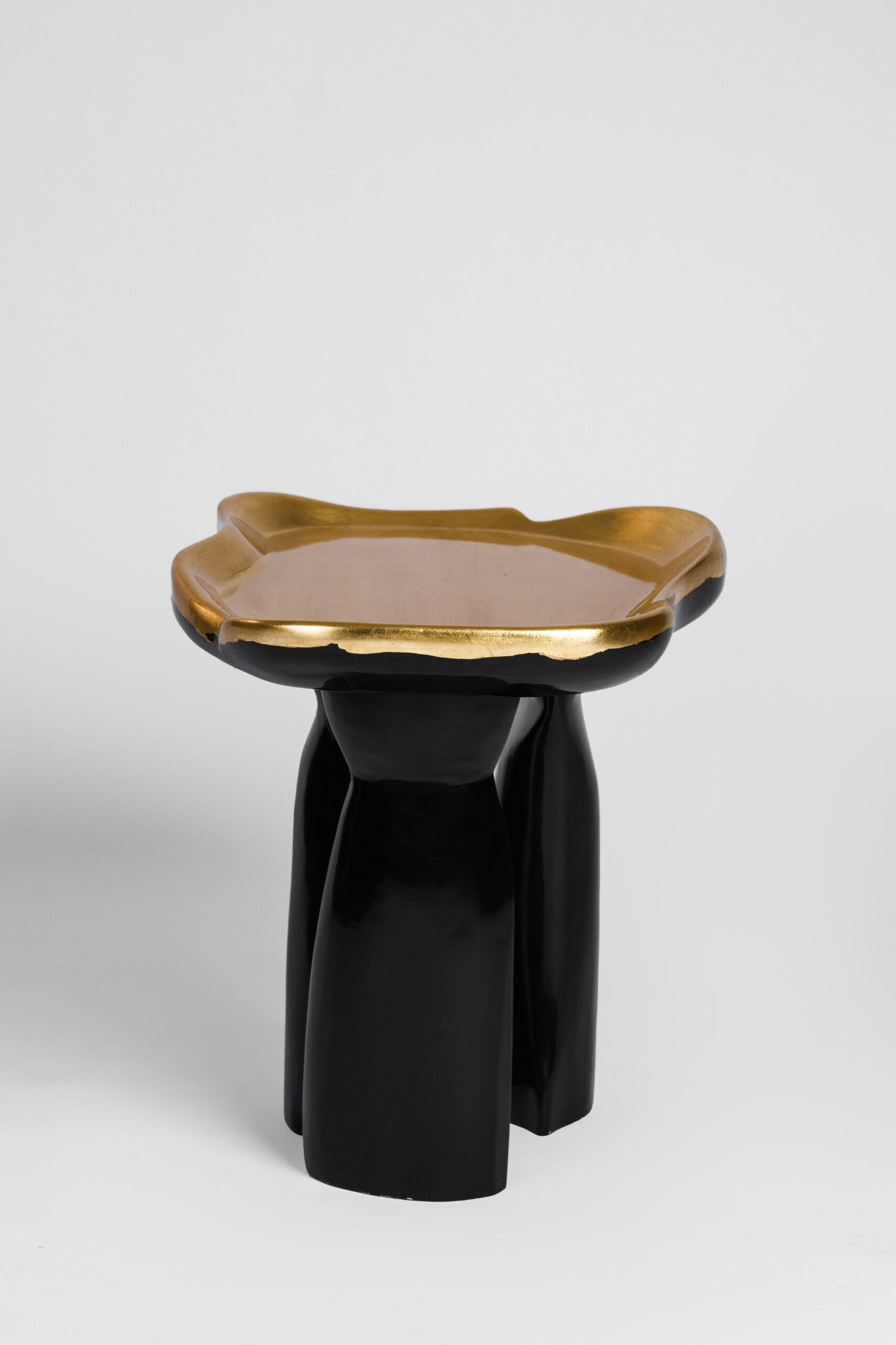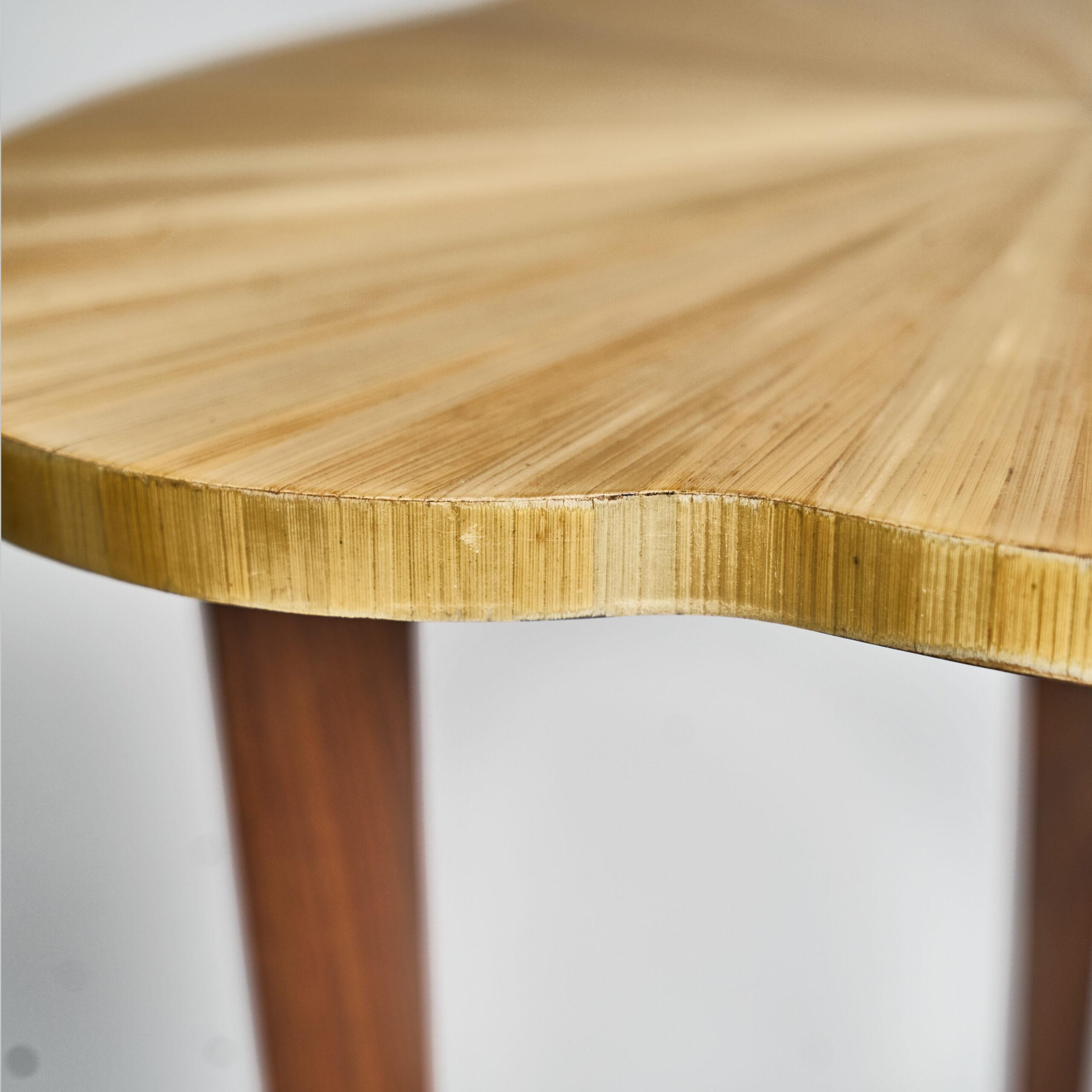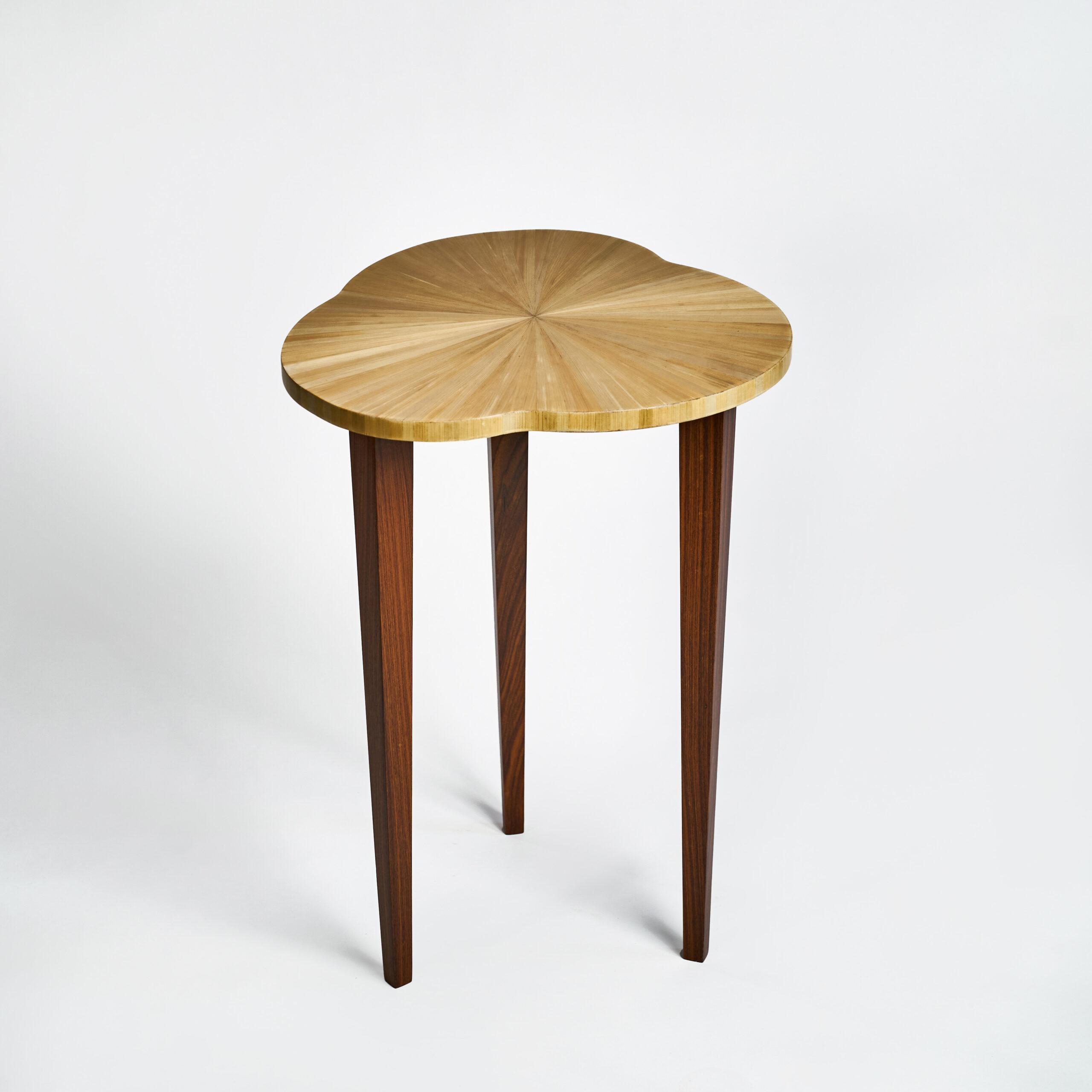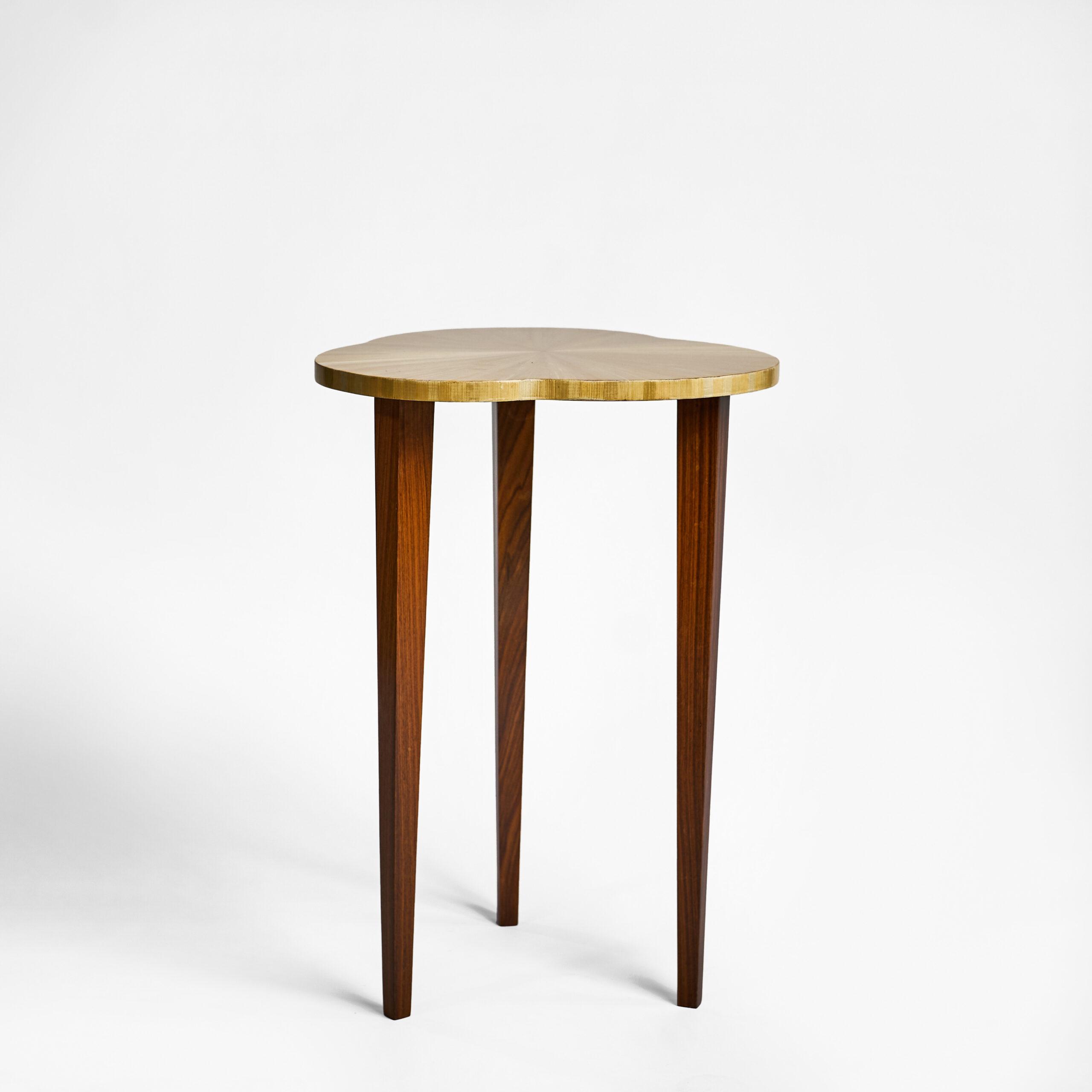 The royal side table is crafted with the straw marquetry at the top with a ray pattern that gives a feeling of vitality, activity, and luxury. The palisander legs, stained dark brown with matte polyester lacquer finish, provide the table with strength and elegance.