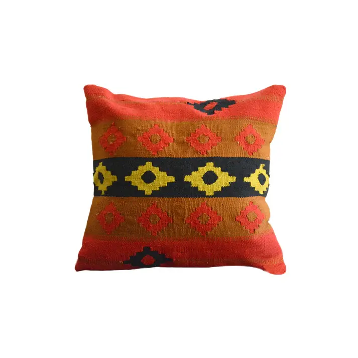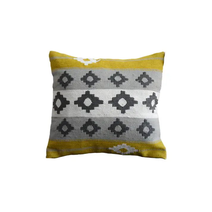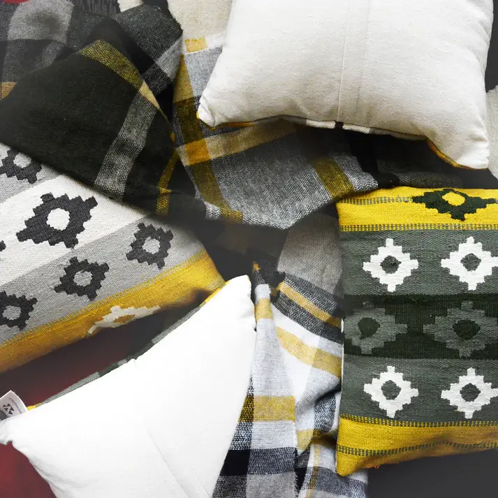 Cushion cover of handwoven natural cottonl, with a fabric back and an inner bag filled with fibre.