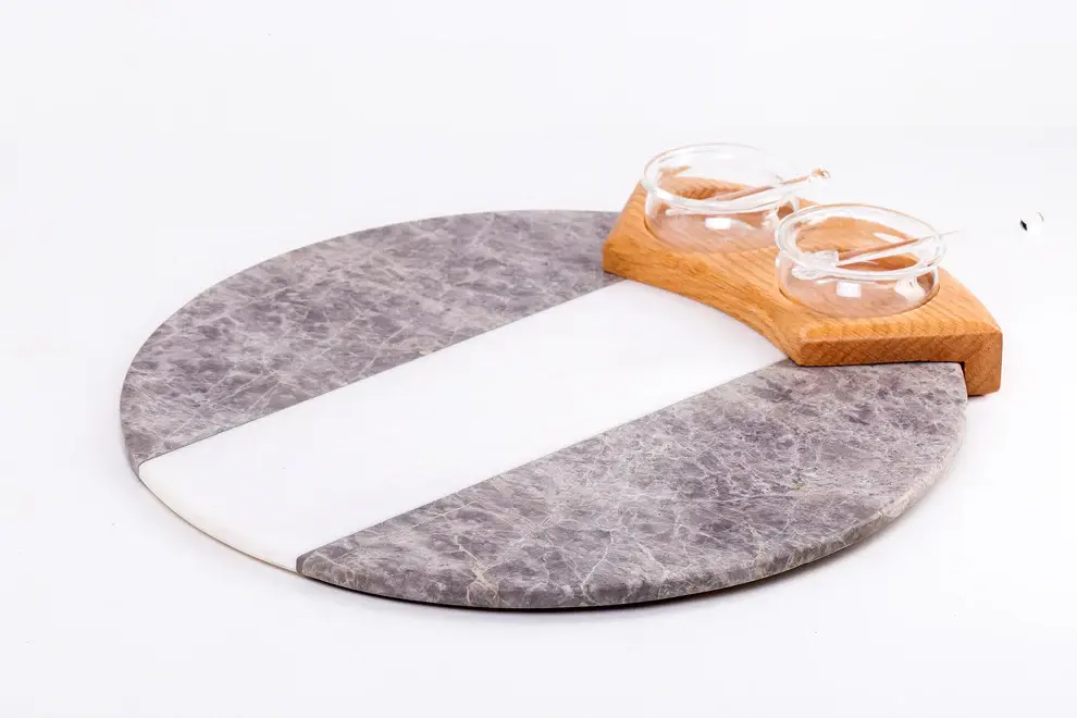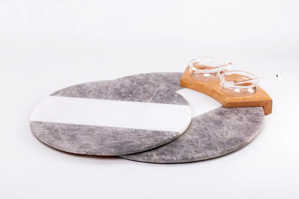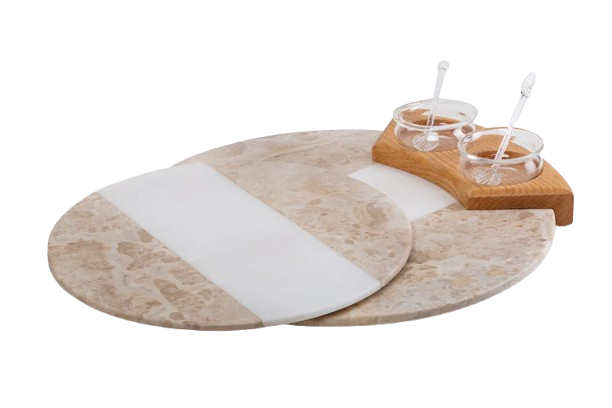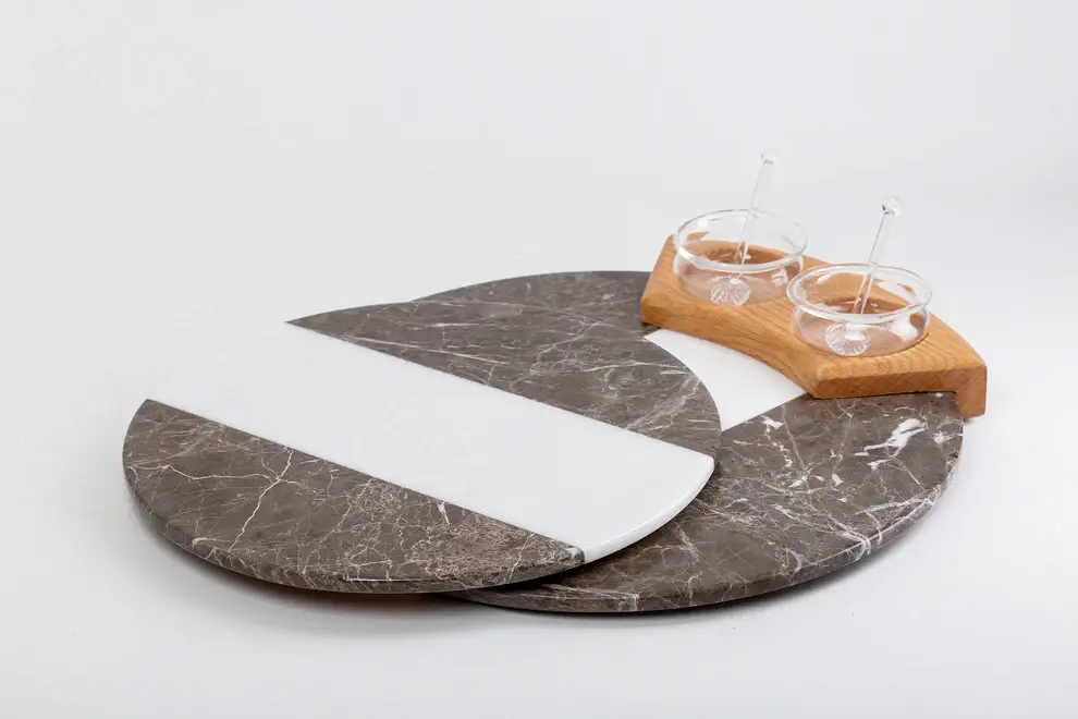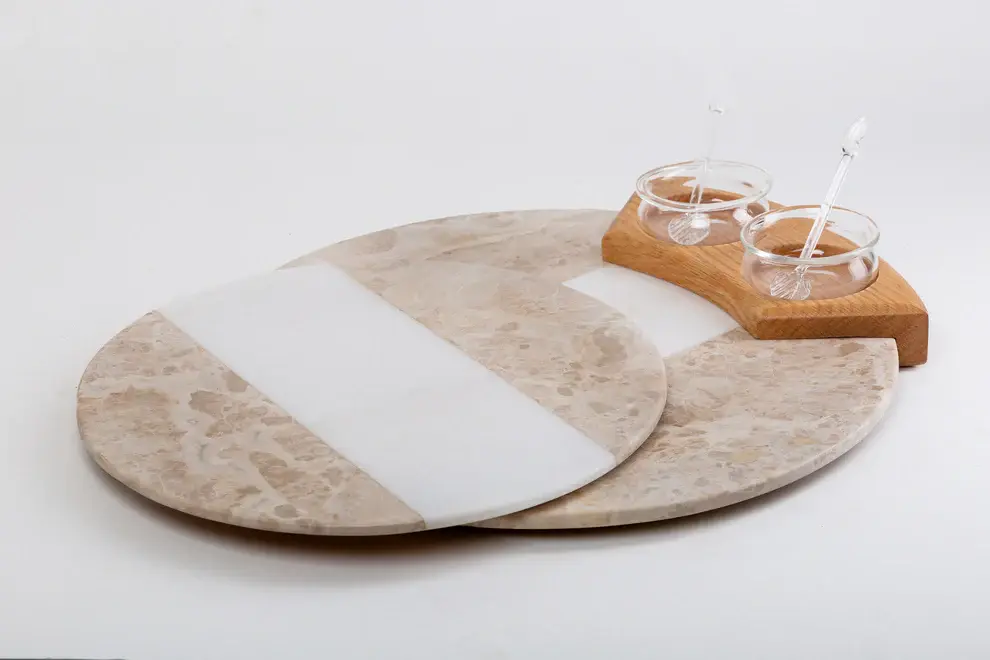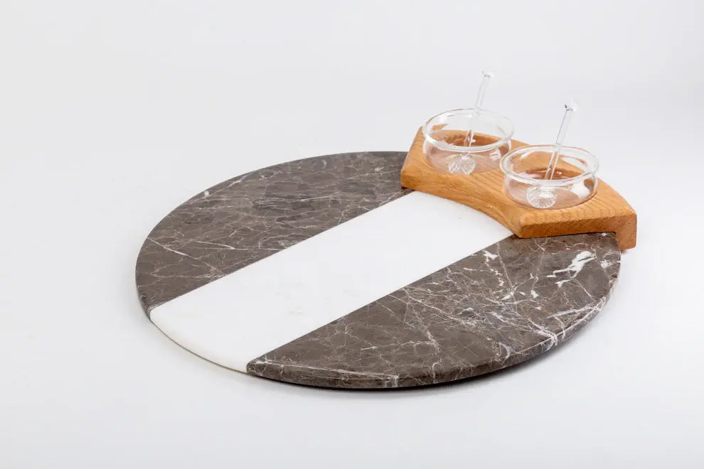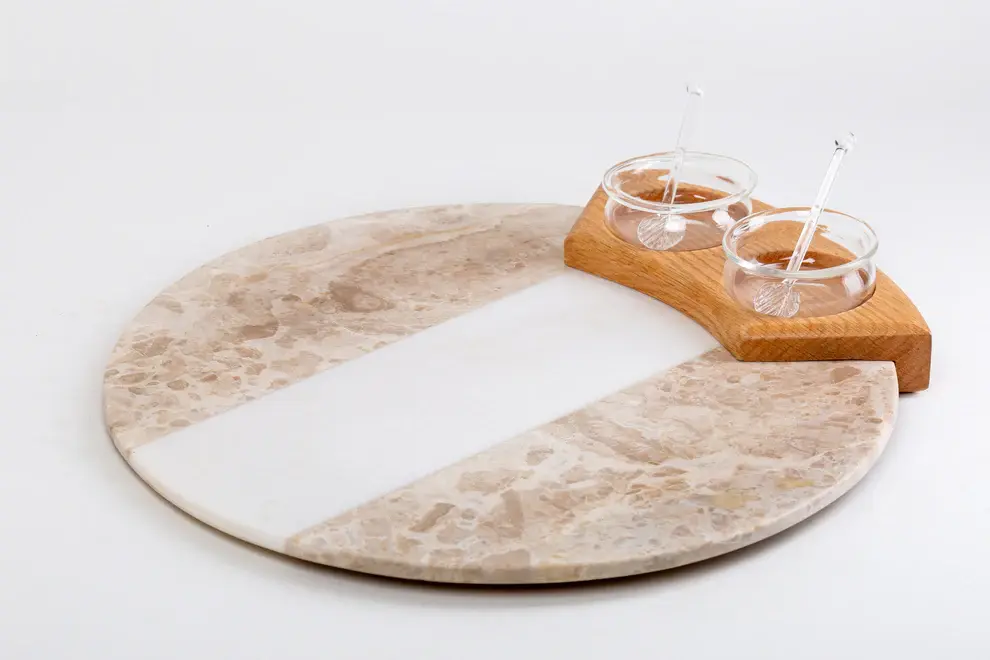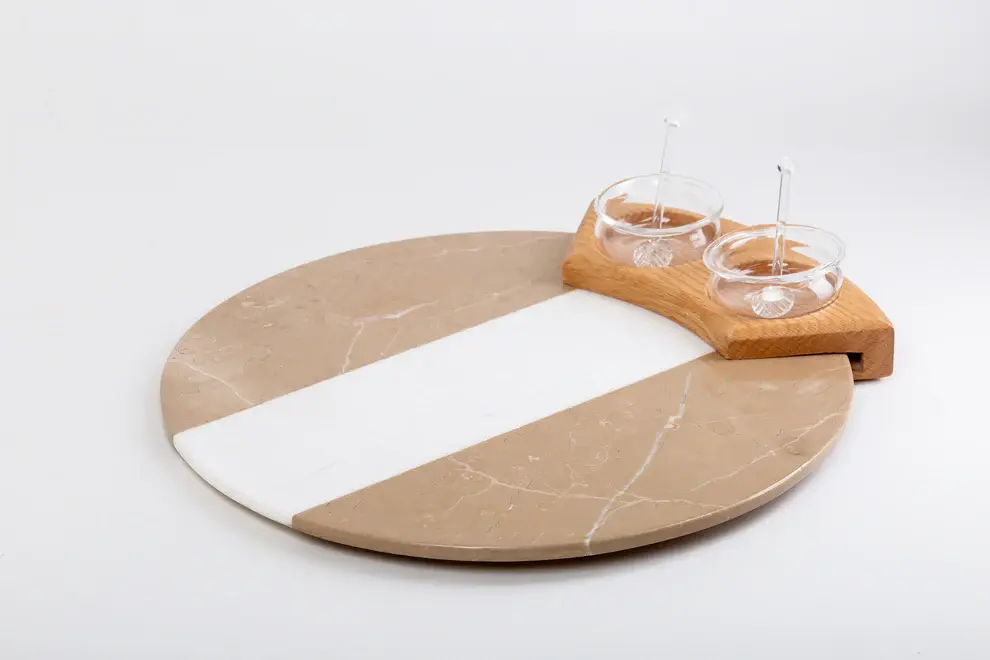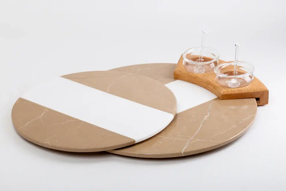 SERVING TRAY MADE OF THE FINEST EUROPEAN MARBLE AND WOOD FOR MULTIPLE PURPOSES, TREATED WITH EPOXY AGAINST NATURAL FACTORS.