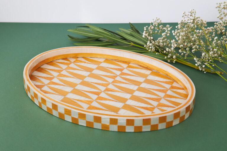 Highest quality of wood with glossy finish inlaid with mixture of mother of pearl and acrylic