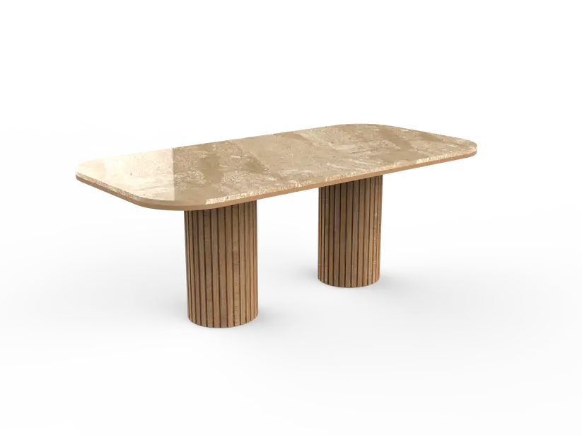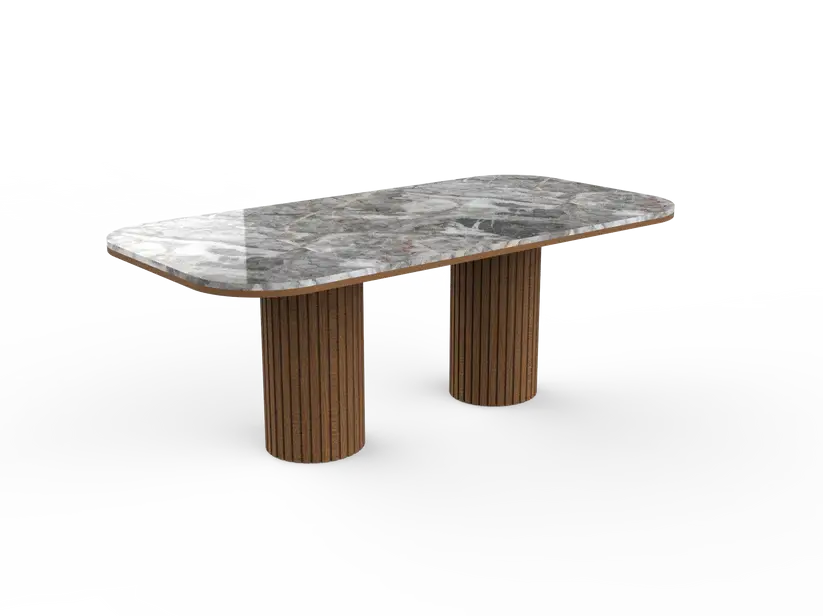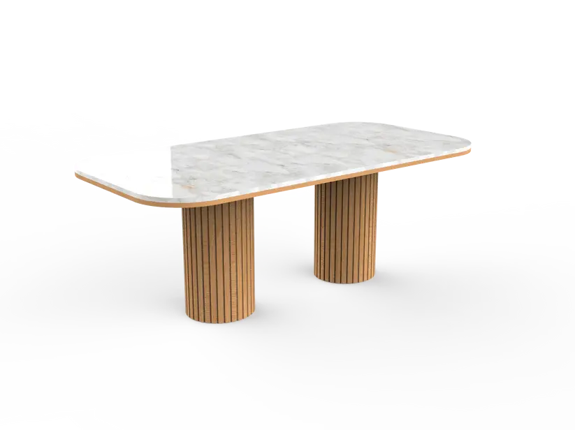 Elevate your dining experience with our Shimmer Dining Table. Crafted with wooden strips and a luxurious marble top, this table adds a touch of elegance to any meal. Enjoy the sleek design and sturdy construction for years to come. Upgrade your dining room today!