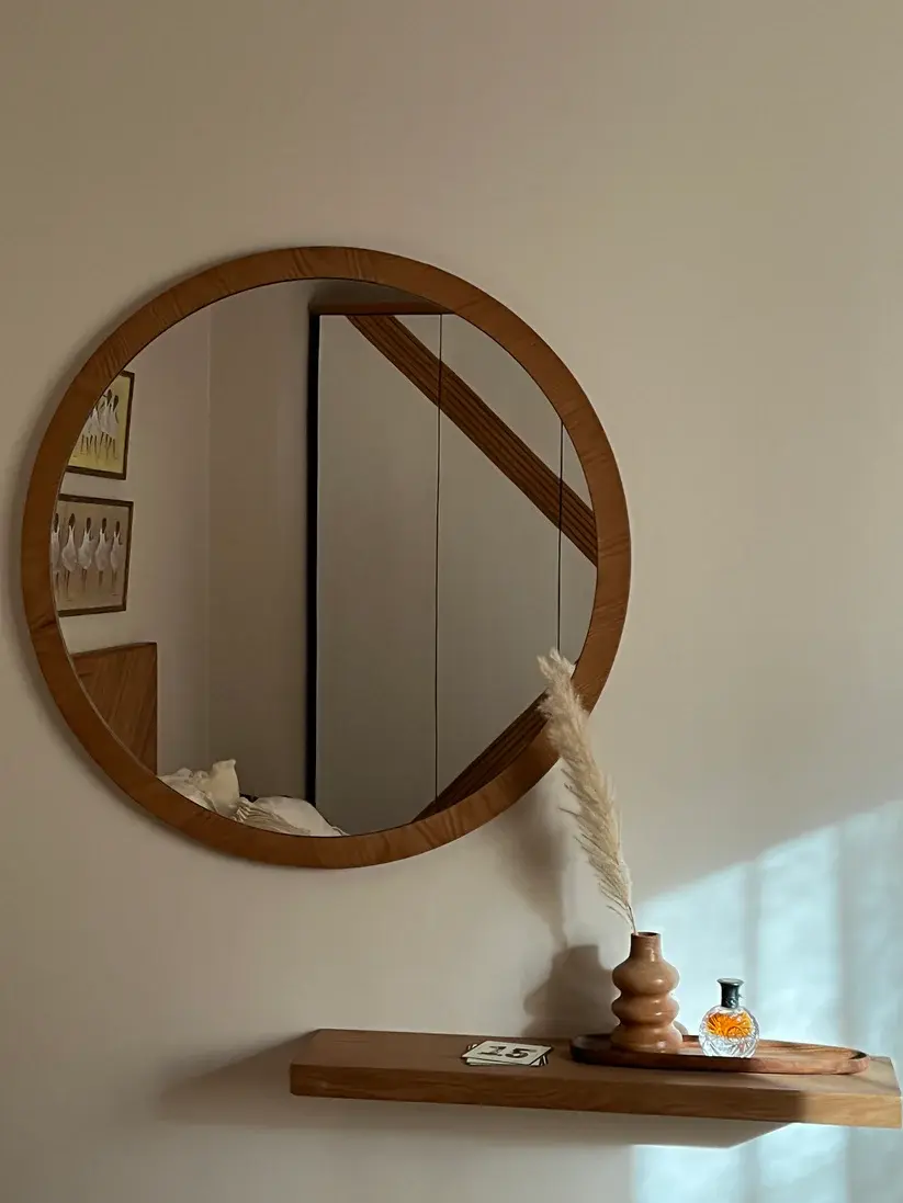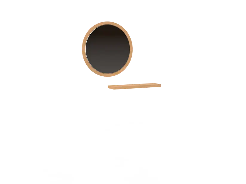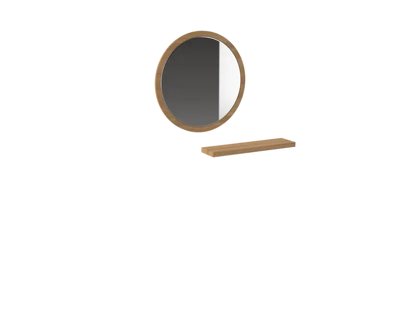 Dimensions: 80x20 cm shelf, mirror with the diameter of 78 cm and 4 cm wooden frame