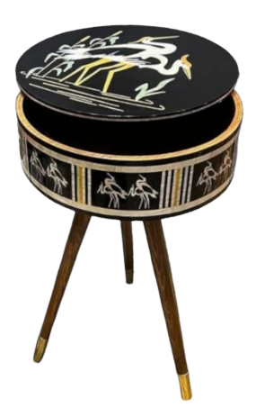 Natural wood table covered with mother-of-pearl. Beech wood legs with brass heels .