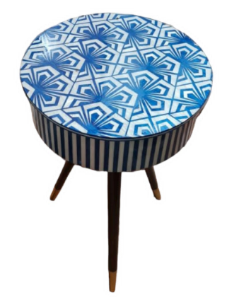 A table of Geometric green and white seashell tray of natural wood covered with mother-of-pearl in blue, green or black with white.