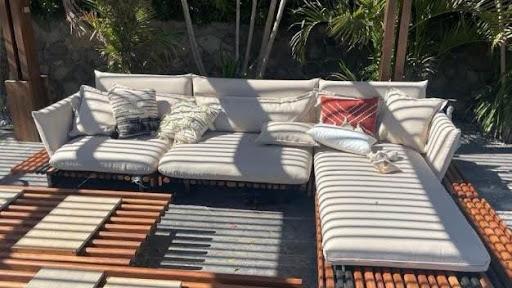 Our striped sectional set has a unique design that enhances any outdoor space. its neutral color makes it an addition to any outdoor setting. Enjoy lasting comfort and style with this durable outdoor sofa.