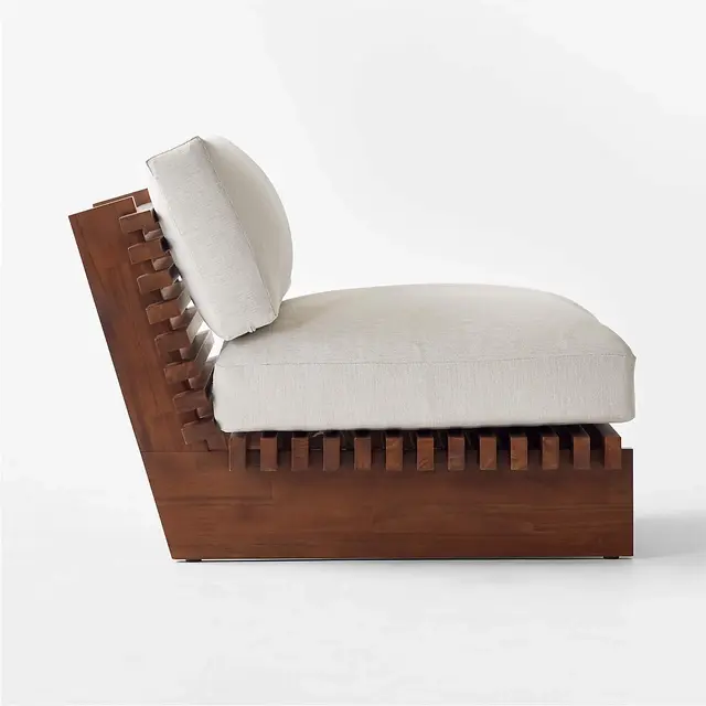 Low-slung and appealingly boxy outdoor chair by Ceci Thompson looks rich in stained teak wood. Inspired by Japanese joinery, rows of horizontal teak slats exude a minimalist and modern attitude, while removable, fade-resistant natural cushion covers are tailored to fit just so.